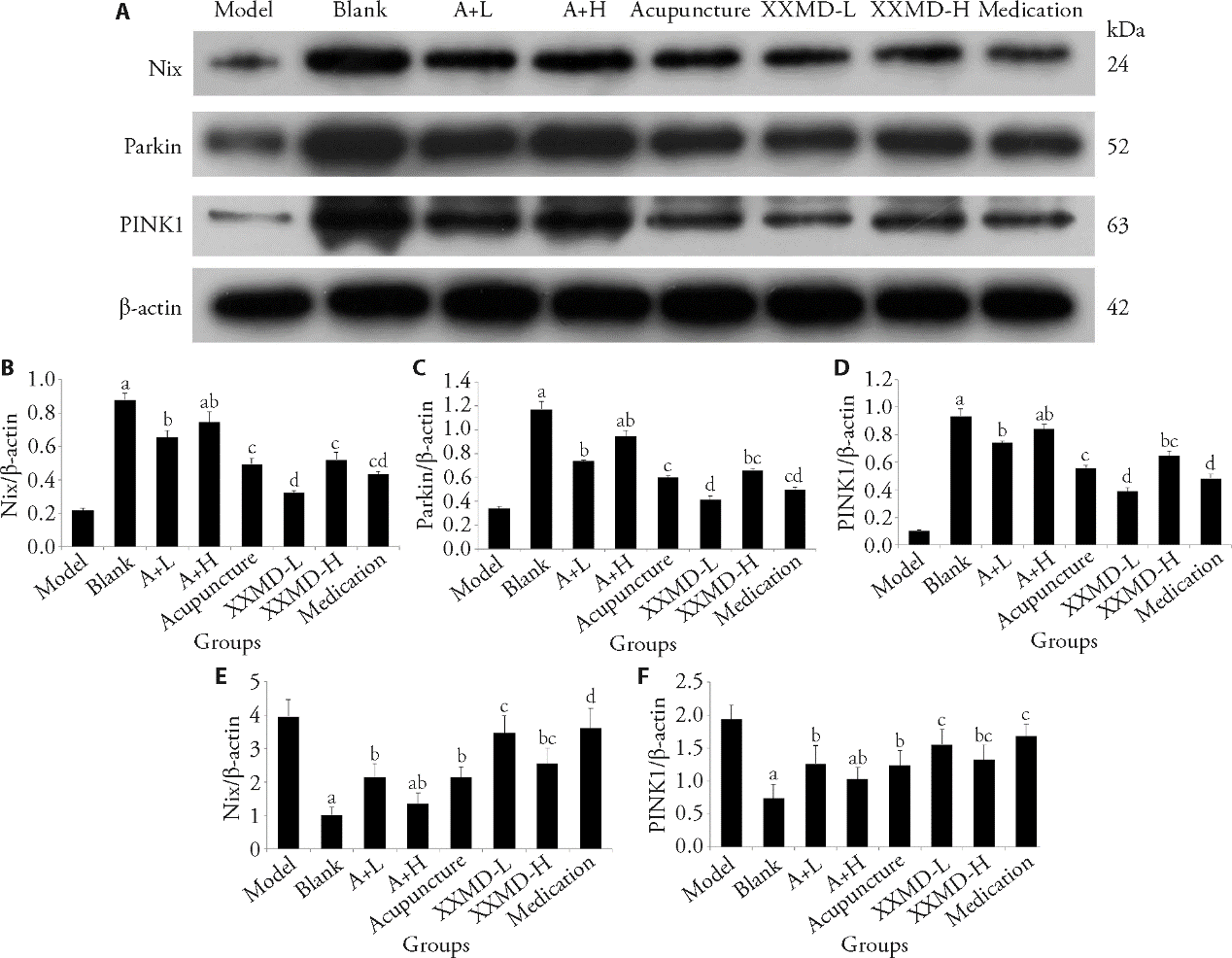 METHODS: C57BL/6 mice were randomly divided into eight groups (n = 12), including blank group, model group, medication group, acupuncture group, high-dose XXMD group (XXMD-H), low-dose XXMD group (XXMD-L), acupuncture combined with high-dose XXMD group (A+H), and acupuncture combined with low-dose XXMD group (A+L). After treatment for 6 weeks, dopamine (DA) neurons and the pathological changes of tyrosine hydroxylase (TH) positive cells were observed. The enzyme-linked immunosorbent assay (ELISA) was used to measure the content of DA and the level of interleukin-1β (IL-1β), interleukin-6 (IL-6), interleukin-10 (IL-10) and tumor necrosis factor alpha (TNF-α). The mRNA level of PINK1 and Parkin and the protein expression of Nix, PINK1 and Parkin in the substantia nigra were also detected.