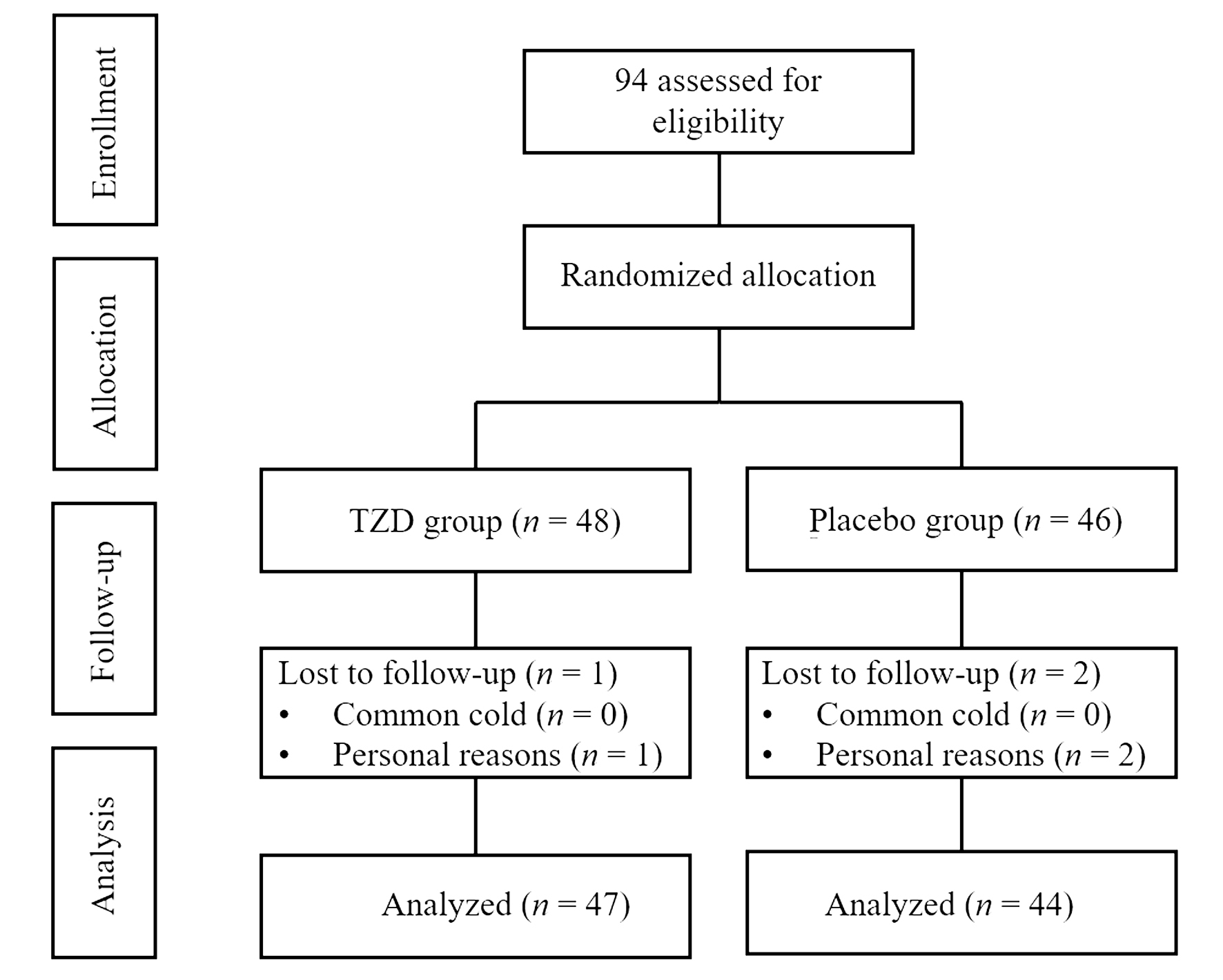 METHODS: This study is a randomized, double-blind placebo-controlled, and single-center clinical trial. In April 2021, during the spring pollen season in Beijing, 94 SAR patients aged 19-60 years were randomized (1:1 ratio) to receive two weeks of TZD or placebo. The primary outcomes were the change of Total Nasal Symptom Score (TNSS) and Total Ocular Symptom Score (TOSS) from baseline to the end of treatment. Secondary outcomes were the changed score of the mini Rhinoconjunctivitis Quality of Life Questionnaire (RQLQ), Rescue Medication Score (RMS), and Patient Global Impression of Change (PGIC). All adverse events were recorded and evaluated by two senior physicians.
