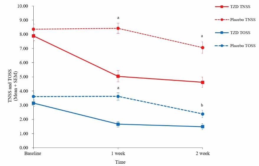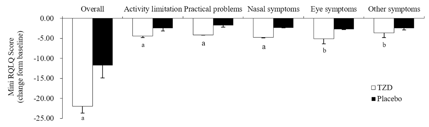 RESULTS: TZD significantly reduced both the total nasal symptom scores and total ocular symptom scores compared to scores at baseline, while the placebo group showed an increasing trajectory in both symptom scores. Compared to the placebo group, the TZD group also showed a greater improvement in the quality of life, scores of RMS, nasal and eye symptoms scores after TZD treatment (P < 0.001). Most notably, at the end of treatment, the proportion of remission measured by PGIC was significantly higher in the TZD group (82.97%) compared with the placebo group (47.72%, P < 0.001).
