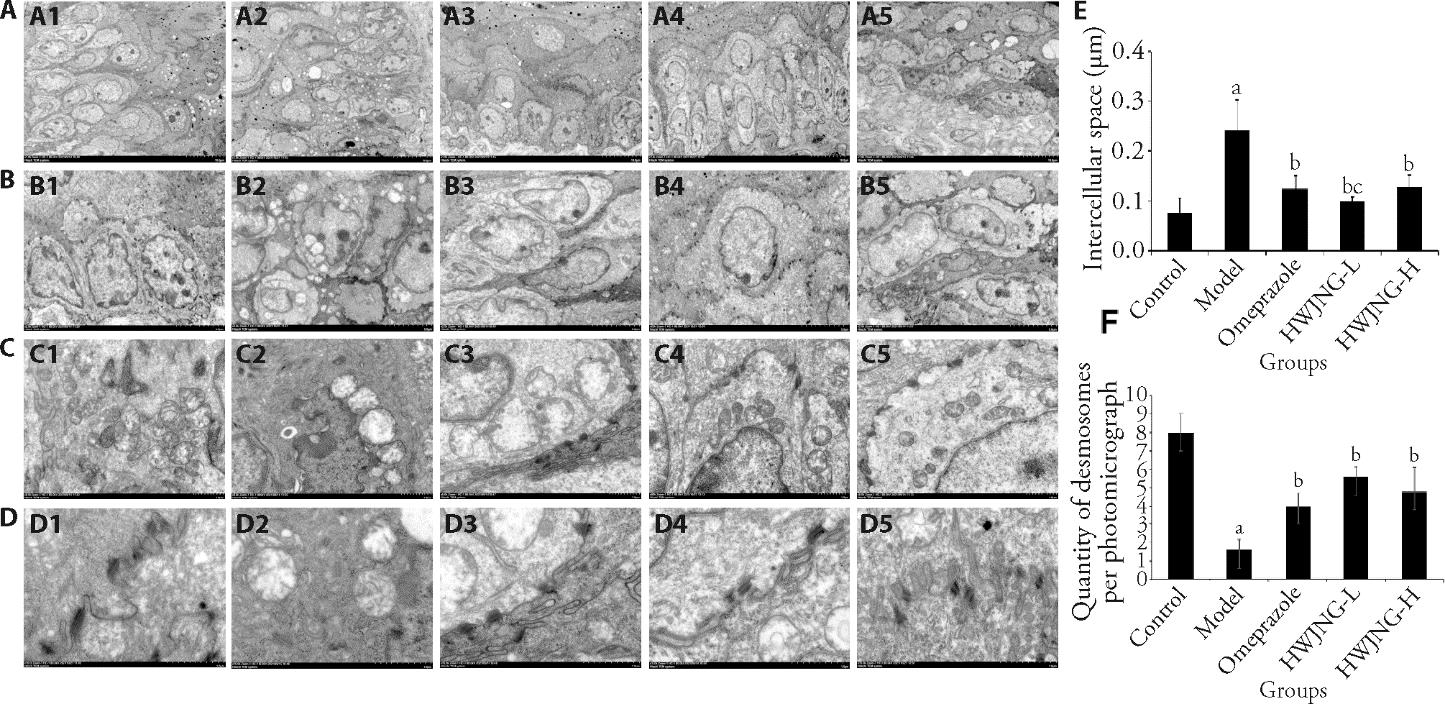 Figure 2 Observation of pathological damage in non-erosive reflux disease repaired by HWJNG under electron microscopy A: dilated epithelial cell space (× 1000); B: dilated intercellular space (× 2500); C: mitochondria morphological changes (× 8000); D: desmosome morphological changes (× 15 000); E: width of mucosal intercellular space (× 2500); F: quantity of desmosomes (× 15000). A1, B1, C1, D1: Control group; A2, B2, C2, D2: model group; A3, B3, C3, D3: omeprazole group; A4, B4, C4, D4: HWJNG-L group; A5, B5, C5, D5: HWJNG-H group. Control group: deionized water; Model group: fructose water and restraint stress; Omeprazole group: model group + Omeprazole at 0.06 mg·kg-1·d-1; HWJNG-L: low dose of HWJNG at 0.24 g/kg; HWJNG-H: high dose of HWJNG at 0.48 g/kg. HWJNG: Hewei Jiangni granule. Statistical analyses were measured using one-way analysis of variance for multimal comparisons. Data were presented as mean ± standard deviation (n = 5). Compared with the control group, aP < 0.001; compared with the model group, bP < 0.001; compared with the HWJNG-H group, cP < 0.05.
