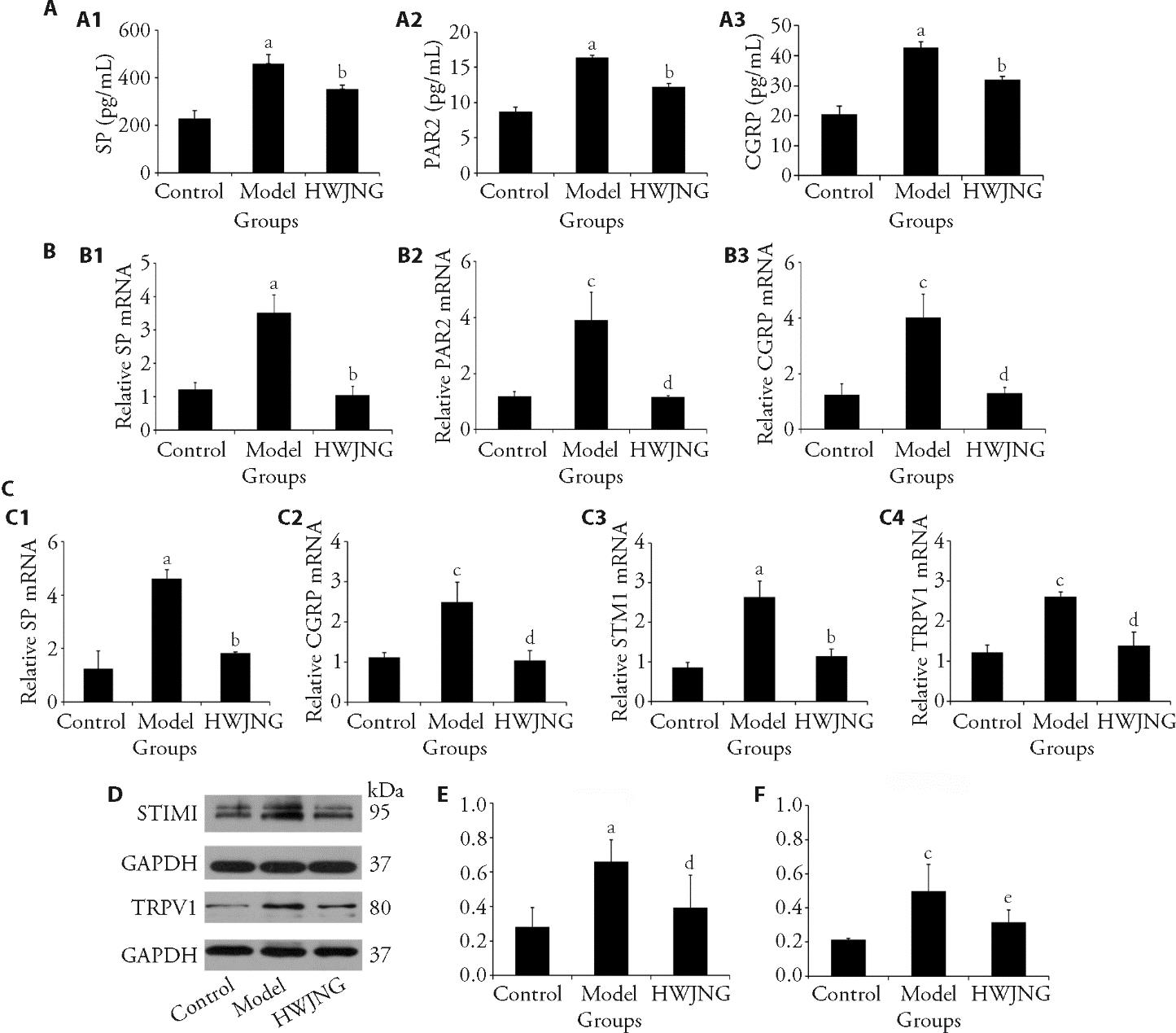 Figure 3 HWJNG treatment regulates protein and mRNA expressions of STIM1, TRPV1 and related neurotransmitters in esophageal mucosa and DRG of mice A: relative protein levels of SP, PAR2, and CGRP in esophageal mucosa (n = 5). A1: SP; A2: PAR2; A3: CGRP. B: relative m RNA levels of SP, PAR2 and CGRP assessed in esophageal mucosa (n = 3). B1: SP; B2: PAR2; B3: CGRP. C: relativemRNA levels of SP, CGRP, STIM1 and TRPV1 assessed in DRG (n = 3). C1: SP; C2: CGRP; C3: STIM1; C4: TRPV1. D: representative band of STIM1 and TRPV1 protein detected by WB in DRG (n = 3). E: relative protein levels of STIM1 results in DRG (n = 3). F: relative protein levels of TRPV1 results in DRG (n = 3). Control group: deionized water; Model group: fructose water and restraint stress; HWJNG: Low dose of HWJNG at 0.24 g/kg + high dose of HWJNG at 0.48 g/kg. STIM1: stromal interaction molecule 1; TRPV1: transient receptor potential vanilloid subfamily member 1; DRG: dorsal root ganglion cells; SP: substance P; PAR2: protease activated receptors-2; CGRP: calcitonin gene-related peptide; HWJNG: Hewei Jiangni granule. Statistical analyses were measured using one-way analysis of variance for multimal comparisons. Data were presented as mean ± standard deviation (n = 5). Compared with the control group, aP < 0.001, cP < 0.01; compared with the model group, bP < 0.001, dP < 0.01. eP < 0.05.