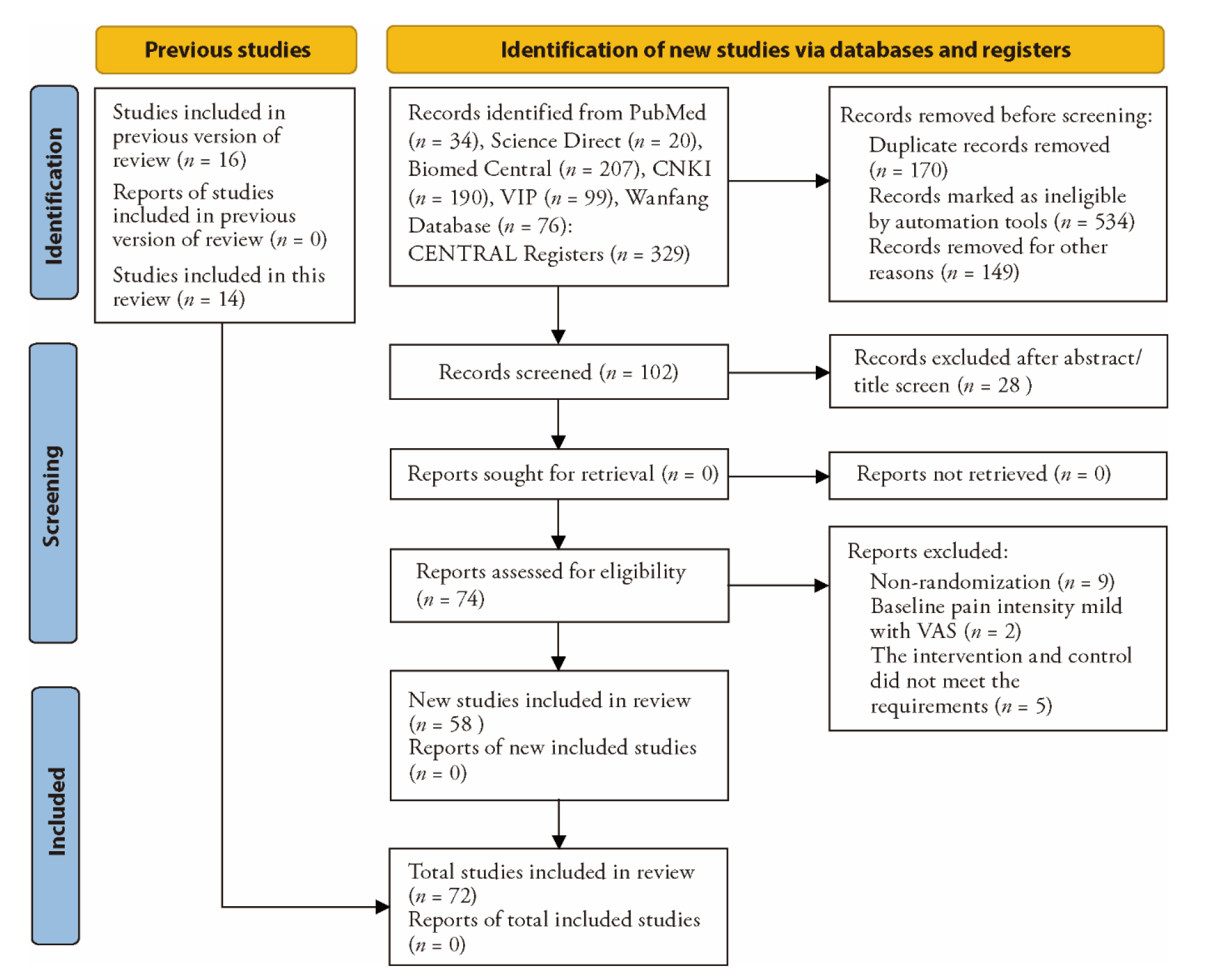 Figure 1 PRISMA 2020 flow diagram for updated systematic reviews PRISMA: preferred reporting items for systematic review and Meta-analyses; CNKI: Chinese national knowledge infrasturcture; VIP: China science and technology journal database; CENTRAL: Cochrane central registre of controlled trials; VAS: visual analog scale.