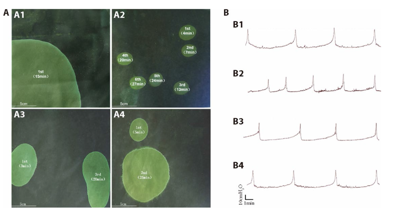Figure 1 Effect of EA on OAB symptoms in rats A1-A4: representative urine spot plots. B1-B4: urodynamic diagram. A1, B1: no modeling or treatment was administered. A2, B2: a single intraperitoneal injection of 2.5% cyclophosphamide (150 mg/kg) without any treatment. A3, B3: EA: treatment once daily for three consecutive days after molding. A4, B4: HC-067047 (TRPV4 antagonist) (0.2 mL/time) was instilled into the bladder for 3 consecutive days after molding. EA: electroacupuncture; OAB: overactive bladder; TRPV4: transient receptor potential vanilloid 4.