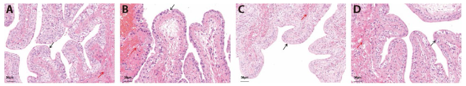 Figure 2 Bladder urothelium tissue structure [HE staining of the bladder wall (×20)] A: control; B: Model; C: EA; D: HC-067047. Control: no modeling or treatment was administered; Model: a single intraperitoneal injection of 2.5% cyclophosphamide (150 mg/kg) without any treatment. EA: EA treatment once daily for three consecutive days after molding. HC-067047 (TRPV4 antagonist): HC-067047 (0.2 mL/time) was instilled into the bladder for 3 consecutive days after molding. EA: electroacupuncture; HE staining: hematoxylin and eosin staining; TRPV4: transient receptor potential vanilloid 4.