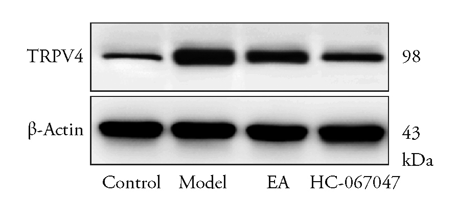 Figure 4 TRPV4 protein expression in the bladder urothelium Control: no modeling or treatment was administered; model: a single intraperitoneal injection of 2.5% cyclophosphamide (150 mg/kg) without any treatment. EA: EA treatment once daily for three consecutive days after molding. HC-067047 (TRPV4 antagonist): HC-067047 (0.2 mL/time) was instilled into the bladder for 3 consecutive days after molding. TRPV4: transient receptor potential vanilloid 4; EA: electroacupuncture.