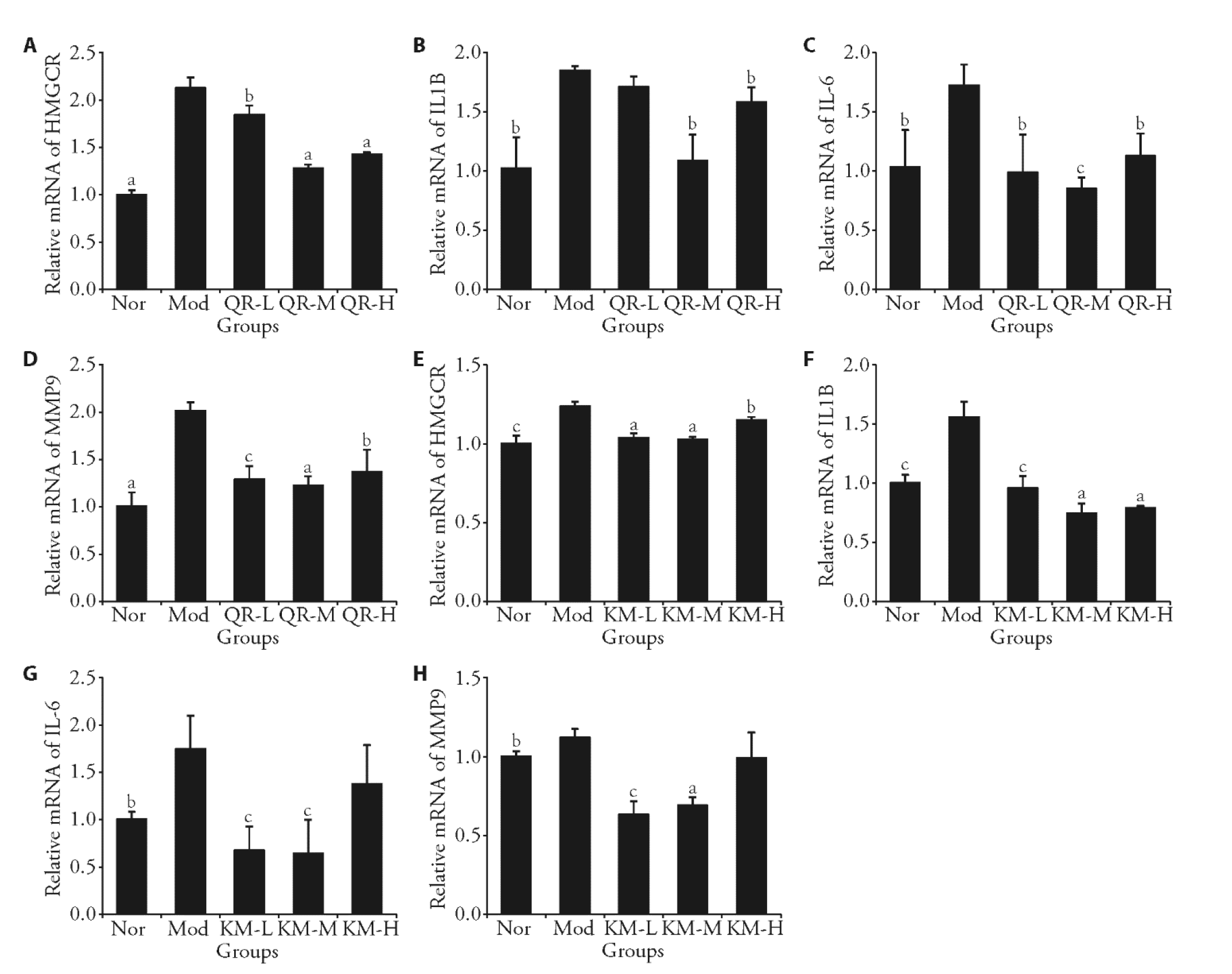 Figure 2 Effect of QR and KM on the mRNA expression of key factors in HepG2 cells A: the expression of HMGCR mRNA in each group of cells by QR; B: the expression of IL1B mRNA in each group of cells by QR; C: the expression of IL-6 mRNA in each group of cells by QR; D: the expression of MMP9 mRNA in each group of cells by QR; E: the expression of HMGCR mRNA in each group of cells by KM; F: the expression of IL-1β mRNA in each group of cells by KM; G: the expression of IL-6 mRNA in each group of cells by KM; H: the expression of MMP9 mRNA in each group of cells by KM. Nor: Normal control group, Mod: Model control group, QR-L: 5μmol/L of quercetin, QR-M: 10 μmol/L of quercetin, QR-H: 20 μmol/L of quercetin, KM-L: 5 μmol/L of kaempferol, KM-M: 10 μmol/L of kaempferol, KM-H: 20 μmol/L of kaempferol. HMGCR: 3-hydroxy-3-methylglutaryl-CoA reductase; QR: quercetin; IL-1β: interleukin 1 beta; IL-6: interleukin-6; MMP9: matrix metalloproteinase 9; KM: kaempferol; QR-L: quercetin low dose group; QR-M: quercetin medium dose group; QR-H: quercetin high dose group; KM-L: kaempferol low dose group; KM-M: kaempferol medium dose group; KM-H: kaempferol high dose group. These data are presented as the mean ± standard deviation (n = 3); t-test, compared with Mod, aP < 0.001, bP < 0.05, cP < 0.01.