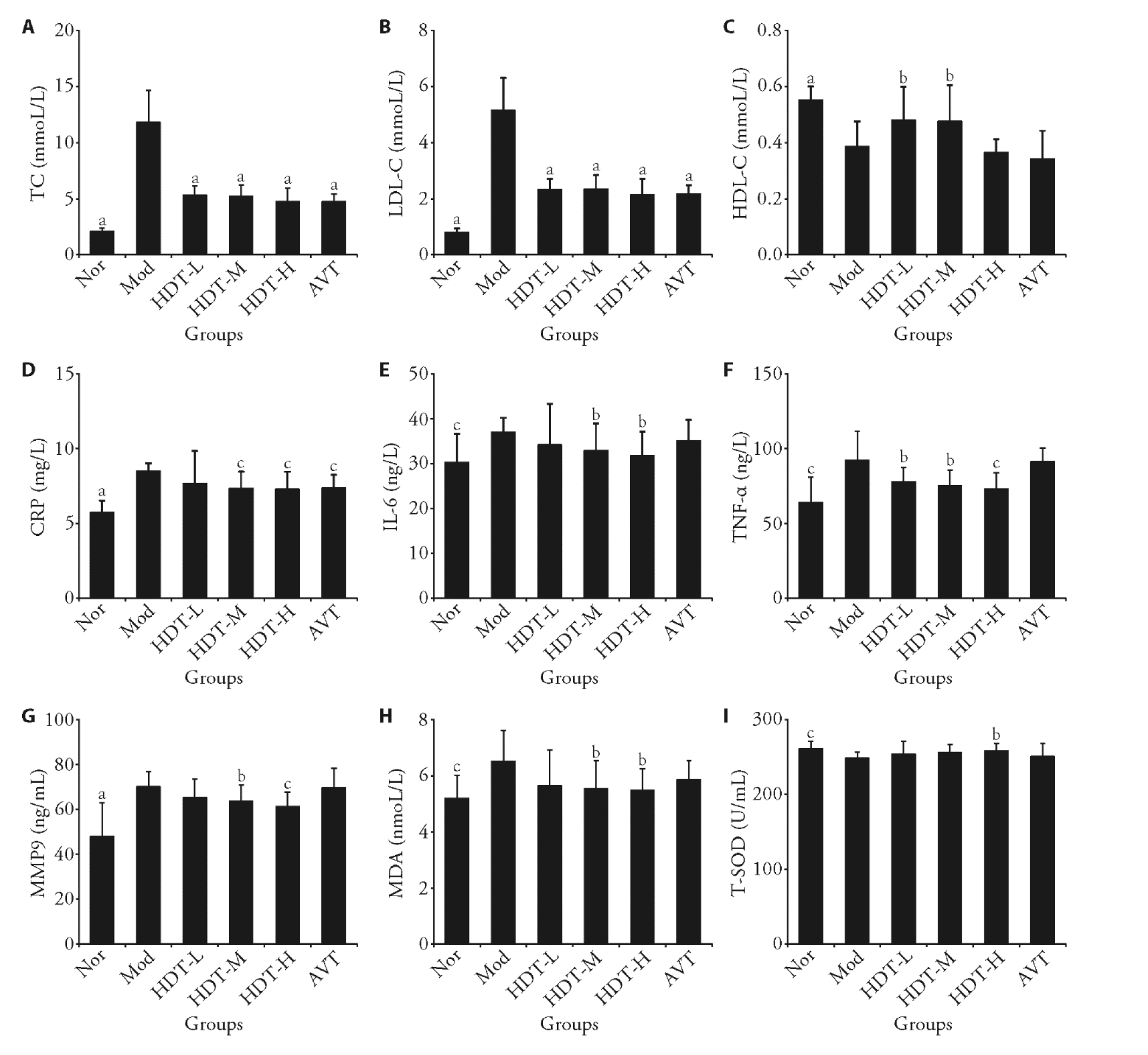 Figure 3 Results of in vivo experiments A: the levels of serum TC in rats; B: the levels of serum LDL-C in rats; C: the levels of serum HDL-C in rats; D: the levels of plasma CRP in rats; E: the levels of plasma IL-6 in rats; F: the levels of plasma TNF-α in rats; G: the levels of plasma MMP9 in rats; H: the levels of plasma MDA in rats; I: the levels of plasma T-SOD in rats. Nor: the normal control group, Mod: the high-fat diet model group, HDT-L: low-dose group of Hedan tablet (0.22 g/kg), HDT-M: medium-dose group of Hedan tablet (0.44 g/kg), HDT-H: high-dose group of Hedan tablet (0.88 g/kg), AVT: atorvastatin (7 mg/kg). TC: serum total cholesterol; LDL-C: low-density lipoprotein cholesterol; HDL-C: high-density lipoprotein cholesterol; CRP: C-reactive protein; IL-6: interleukin-6; TNF-α: tumor necrosis factor-alpha; MMP9: matrix metalloproteinase 9; MDA: malondialdehyde; T-SOD: total superoxide dismutase. These data are presented as the mean ± standard deviation (n = 10); t-test, compared with Mod, aP < 0.001, bP < 0.05, cP < 0.01.