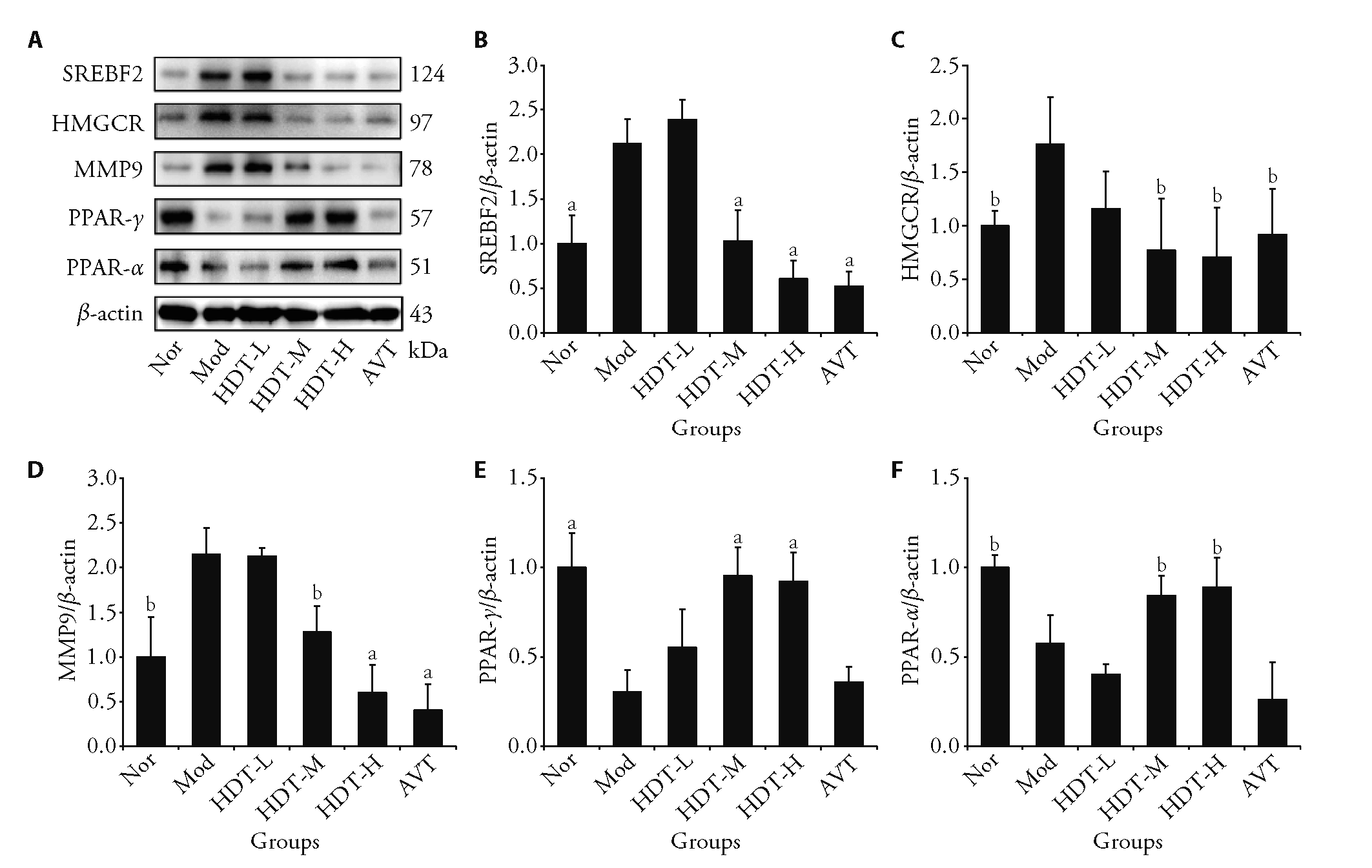 Figure 4 Effects of HDT on expression of proteins for the potential drug targets A: representative photographs of proteins by Western blotting; B: the expression levels of SREBF2; C: the expression levels of HMGCR; D: the expression levels of MMP9; E: the expression levels of PPAR-γ; F: the expression levels of PPAR-α. Nor: the normal control group, Mod: the high-fat diet model group, HDT-L: low-dose group of Hedan tablet (0.22 g/kg), HDT-M: medium-dose group of Hedan tablet (0.44 g/kg), HDT-H: high-dose group of Hedan tablet (0.88 g/kg), AVT: atorvastatin (7 mg/kg) SREBF2: sterol regulatory element-binding transcription factor 2; HMGCR: 3-hydroxy-3-methylglutaryl-CoA reductase; MMP9: matrix metalloproteinase 9; PPAR-γ: peroxisome proliferator-activated receptor gamma. These data are presented as the mean ± standard deviation (n = 3); t-test, compared with Mod, aP < 0.01, bP < 0.05.