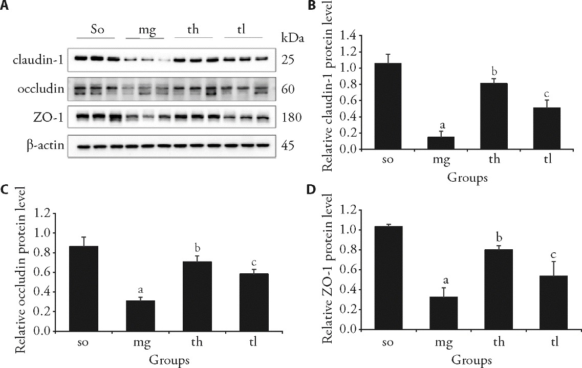 Figure 1 Results of Western blot analysis of claudin-1, occludin, and ZO-1 so: sham operation group; mg: model group; th: high-dose group (TQYZD 9.68 g·kg-1·d-1, 30 d); tl: low-dose group (TQYZD 2.42 g·kg-1·d-1, 30 d). TQYZD: Tongqiao Yizhi decoction; ZO-1: zonula occludens-1. The means of different groups were compared using the one-way analysis of variance test, and multiple comparisons were made after the incident using the least significant difference test. The data were presented as mean ± standard deviation (n = 3). Compared with the so group, aP < 0.05; compared with the mg group, bP < 0.05; compared with the th group, cP < 0.05.