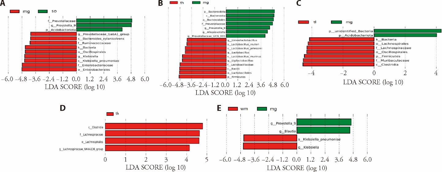 Figure 2 Effect of TQYZD on the gut microbiota of VaD rats (n = 3) A: results of LEfSe analysis of so group vs mg groups; B: results of LEfSe analysis of th group vs mg group; C: results of LEfSe analysis of tl group vs mg groups; D: results of LEfSe analysis of th group vs tl group. E: results of LEfSe analysis of wm group vs mg group. so: sham operation group; mg: model group; th: high-dose group (TQYZD 9.68 g·kg-1·d-1, 30 d); tm: middle-dose group (TQYZD 4.84 g·kg-1·d-1, 30 d); tl: low-dose group (TQYZD 2.42 g·kg-1·d-1, 30 d); wm: Western Medicine group (donepezil hydrochloride, 5 mg·kg-1·d-1, 30 d). The sham operation group and the model group were given 3 mL normal saline by gavage. Gavage once a day in the morning for 30 consecutive days. TQYZD: Tongqiao Yizhi decoction; VaD: vascular dementia; LEfSe: linear discriminant analysis effect size.
