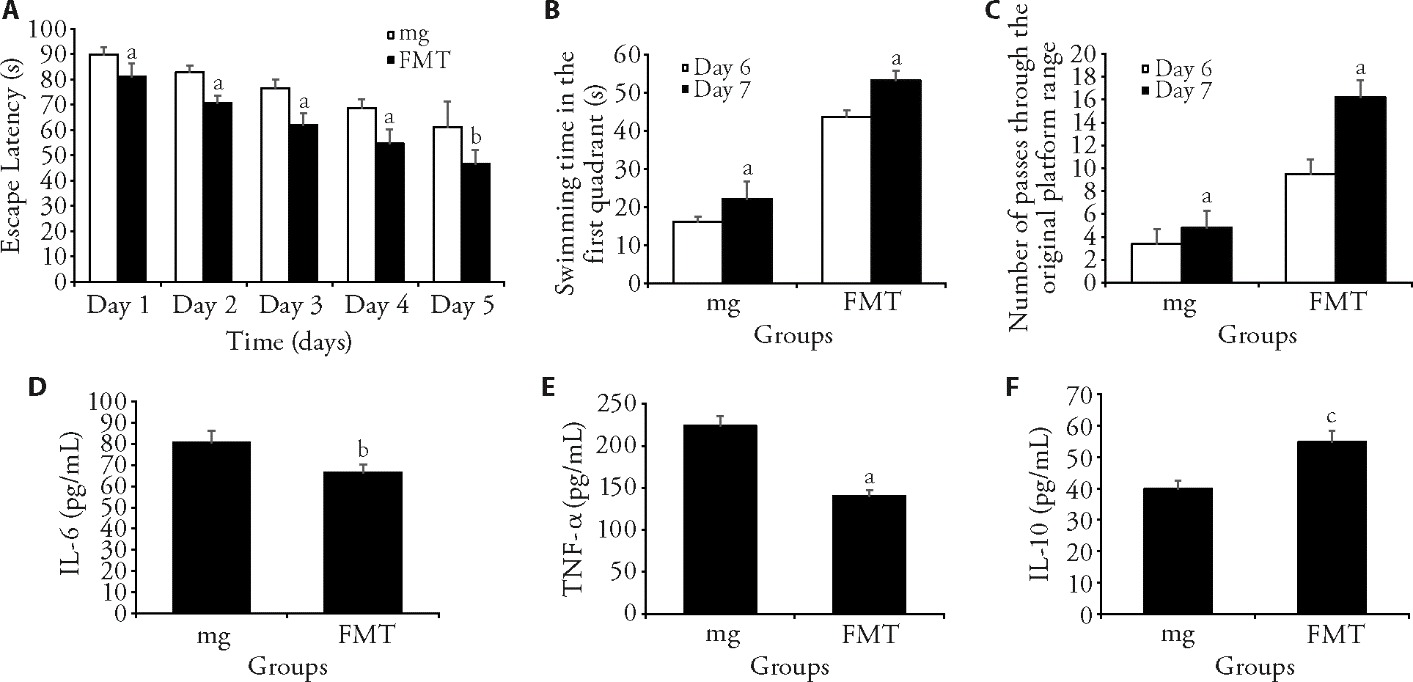 Figure 3 Results of FMT experimental results A: results of positioning navigation experiment; B: swimming time in the quadrant 1; C: number of crossing the original platform range; D: results of ELISA detection of inflammatory factors IL-6; E: results of ELISA detection of inflammatory factors TNF-α; F: results of ELISA detection of anti-inflammatory factors IL-10. TNF-α: tumor necrosis factor-α; IL-6: interleukin-6; IL-10: interleukin-10; mg: model group; FMT: Fecal Microbiota Transplantation group; ELISA: enzyme-linked immunosorbent assay. The model group were given 3 mL normal saline by gavage for 30 consecutive days; The FMT group were given 200 μL supernatant by tube feeding method for 30 consecutive days. The information was presented as mean ± standard deviation (n = 3). The means of different groups were compared using the one-way analysis of variance test, and multiple comparisons were made after the incident using the least significant difference test. The difference between the groups was deemed significant when the test result was P < 0.05. Compared with the mg group, aP < 0.05, bP < 0.01, cP < 0.001.