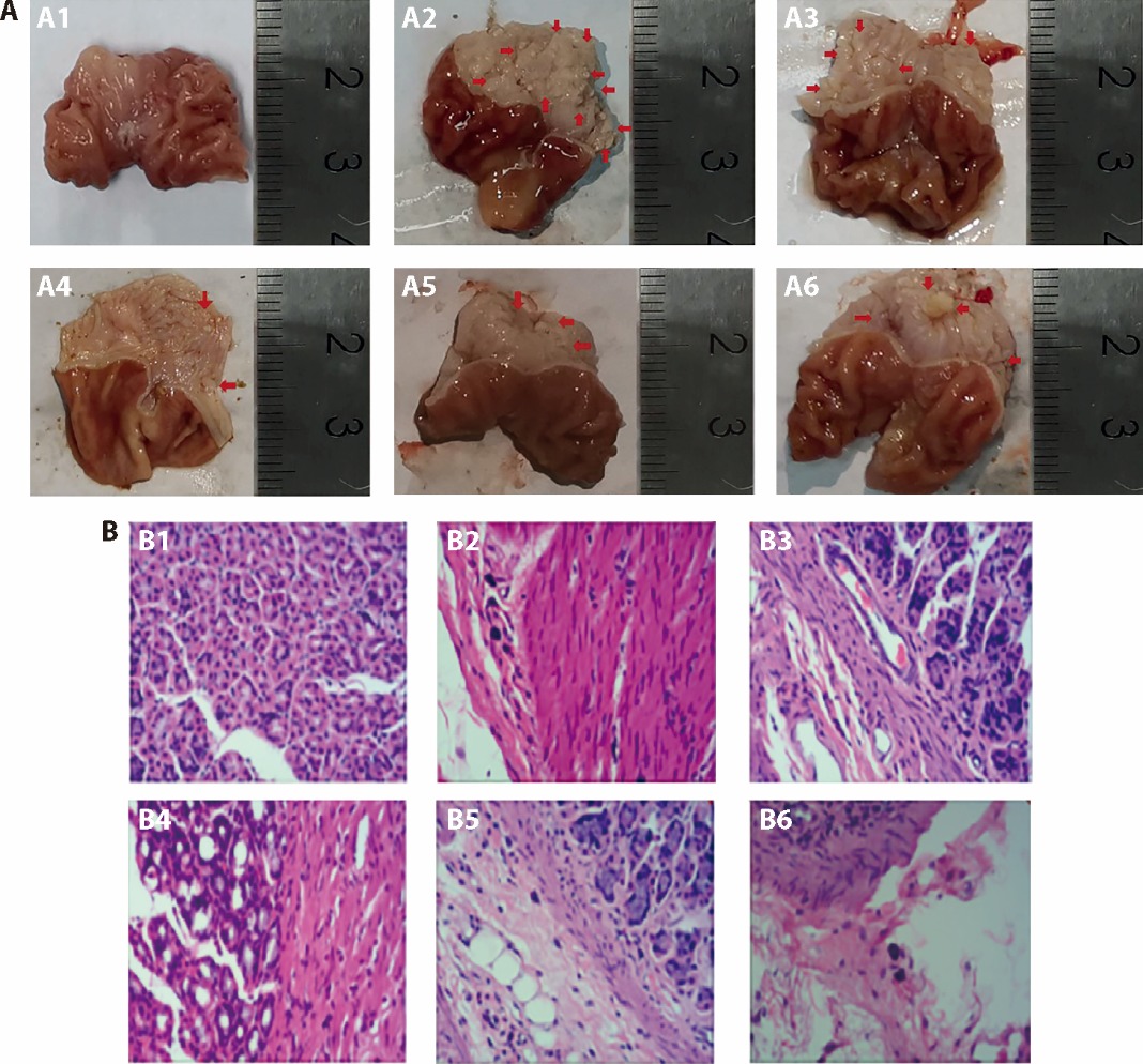 Figure 1 Effects of Jiawei Huangqi Guizhi decoction on gastric histopathology in rats with chronic atrophic gastritis. A: gross anatomy of gastric tissues in different groups; B: HE-stained gastric pathological sections. Magnification: × 100, × 200. A1, B1: NC group; A2, B2: MC group; A3, B3: AC group; A4, B4: HH group; A5, B5: HM group; A6, B6: HL group. NC group: normal rats without modeling or treatment (n = 10); MC group: rats with CAG induced by MNNG, without treatment (n = 10); AC group: CAG rats treated with folic acid (5 mg·kg-1·d-1, gavage, n = 10); HH group: CAG rats treated with high-dose Jiawei Huangqi Guizhi decoction (28 g/kg crude drug, gavage, n = 10); HM group: medium-dose group (14 g/kg crude drug, gavage, n = 10); HL group: low-dose group (7 g/kg crude drug, gavage, n = 10). All interventions were administered by gavage, once daily, 5 d per week for 6 weeks. HE: hematoxylin and eosin; MNNG: methylnitronitrosoguanidine; CAG: chronic atrophic gastritis.