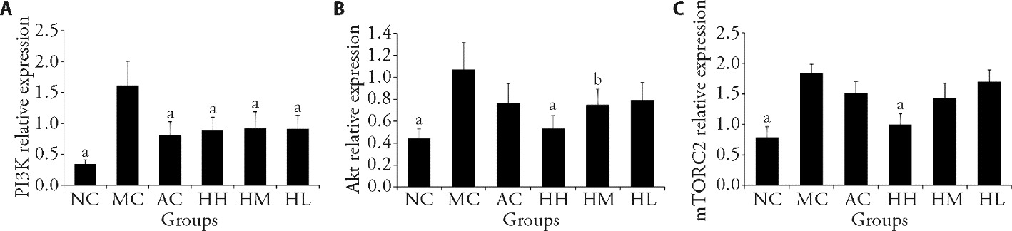 Figure 3 Comparison of PI3K, Akt and mTORC2 mRNA expression levels in gastric mucosa of CAG rats. A-C: relative mRNA expression levels of PI3K (A), Akt (B), and mTORC2 (C) in each group after 6-week treatment. NC group: normal rats without modeling or treatment (n = 10); MC group: rats with chronic atrophic gastritis (CAG) induced by MNNG, without treatment (n = 10); AC group: CAG rats treated with folic acid (5 mg·kg-1·d-1, gavage, n = 10); HH group: CAG rats treated with high-dose Jiawei Huangqi Guizhi decoction (28 g/kg crude drug, gavage, n = 10); HM group: medium-dose group (14 g/kg crude drug, gavage, n = 10); HL group: low-dose group (7 g/kg crude drug, gavage, n = 10). All interventions were administered by gavage, once daily, 5 d per week for 6 weeks. GC: gastric corticosterone; Pi3K: phosphatidylinositol 3-kinase; Akt: protein kinase B; mTORC2: mechanistic target of rapamycin complex 2; CAG: chronic atrophic gastritis. Data are expressed as mean ± standard deviation (n = 10 per group). Statistical significance was determined by one-way analysis of variance. aP < 0.01; bP < 0.05, compared with the model group.