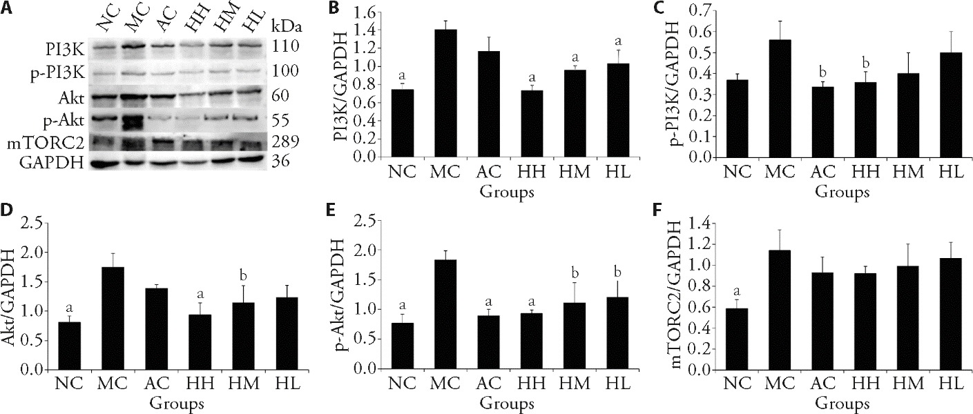 Figure 4 Effect of Jiawei Huangqi Guizhi decoction on the protein expression levels of PI3K/Akt/mTORC2 pathway-related targets in gastric mucosa of CAG rats A: Western blot analysis of PI3K, p-PI3K, Akt, p-Akt and mTORC2 in different groups; B1-B5: quantitative analysis of protein levels of PI3K (B1), p-PI3K (B2), Akt (B3), p-Akt (B4) and mTORC2 (B5), normalized to GAPDH. NC group: normal rats without modeling or treatment (n = 10); MC group: rats with CAG induced by MNNG, without treatment (n = 10); AC group: CAG rats treated with folic acid (5 mg·kg-1·d-1, gavage, n = 10); HH group: CAG rats treated with high-dose Jiawei Huangqi Guizhi decoction (28 g/kg crude drug, gavage, n = 10); HM group: medium-dose group (14 g/kg crude drug, gavage, n = 10); HL group: low-dose group (7 g/kg crude drug, gavage, n = 10). All interventions were administered by gavage, once daily, 5 d per week for 6 weeks. Pi3K: phosphatidylinositol 3-kinase; p-Pi3K: phosphorylated phosphatidylinositol 3-kinase; Akt: protein kinase B; p-Akt: phosphorylated protein kinase B; mTORC2: mechanistic target of rapamycin complex 2s; GADPH: glyceraldehyde-3-phosphate dehydrogenase; CAG: chronic atrophic gastritis. Data are expressed as mean ± standard deviation (n = 10 per group). Statistical significance was determined by one-way analysis of variance. aP < 0.01; bP < 0.05, compared with the model group.