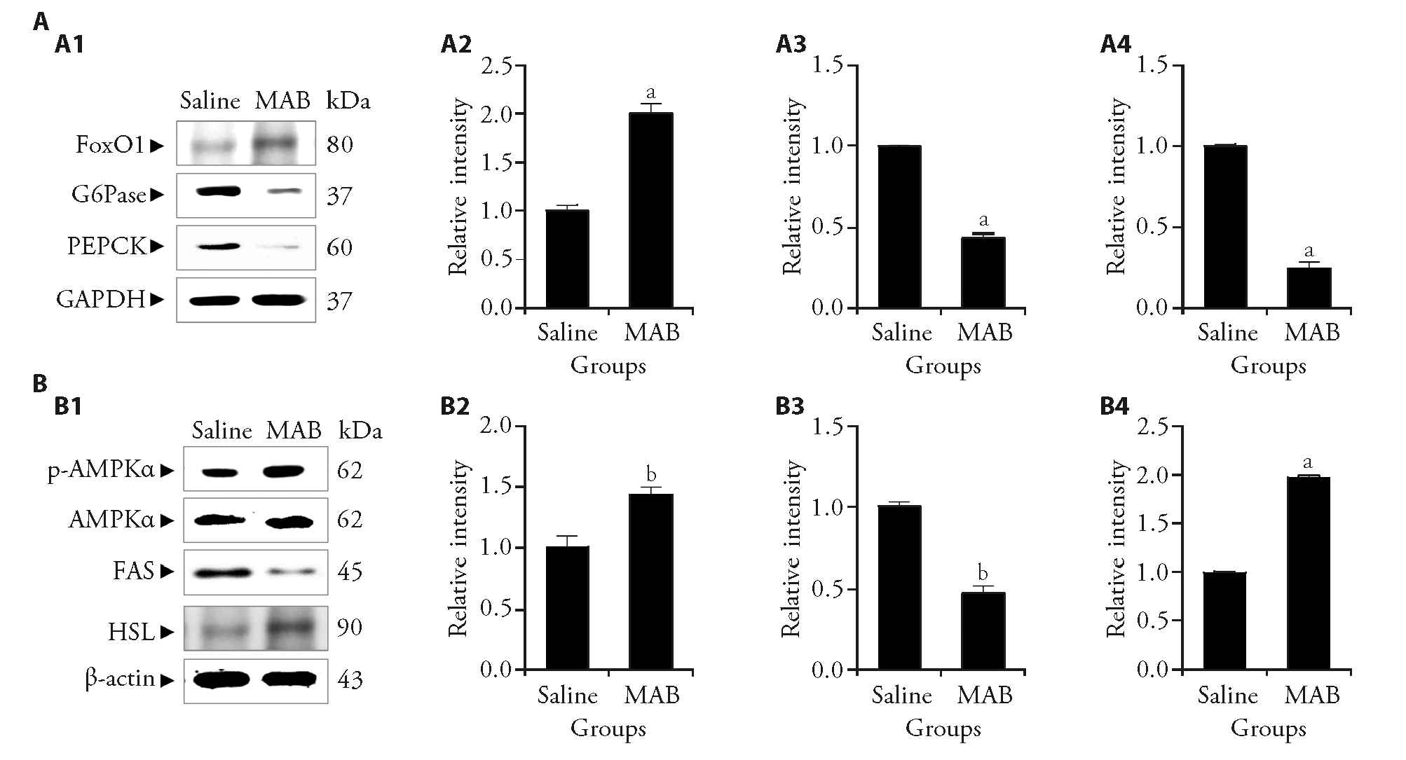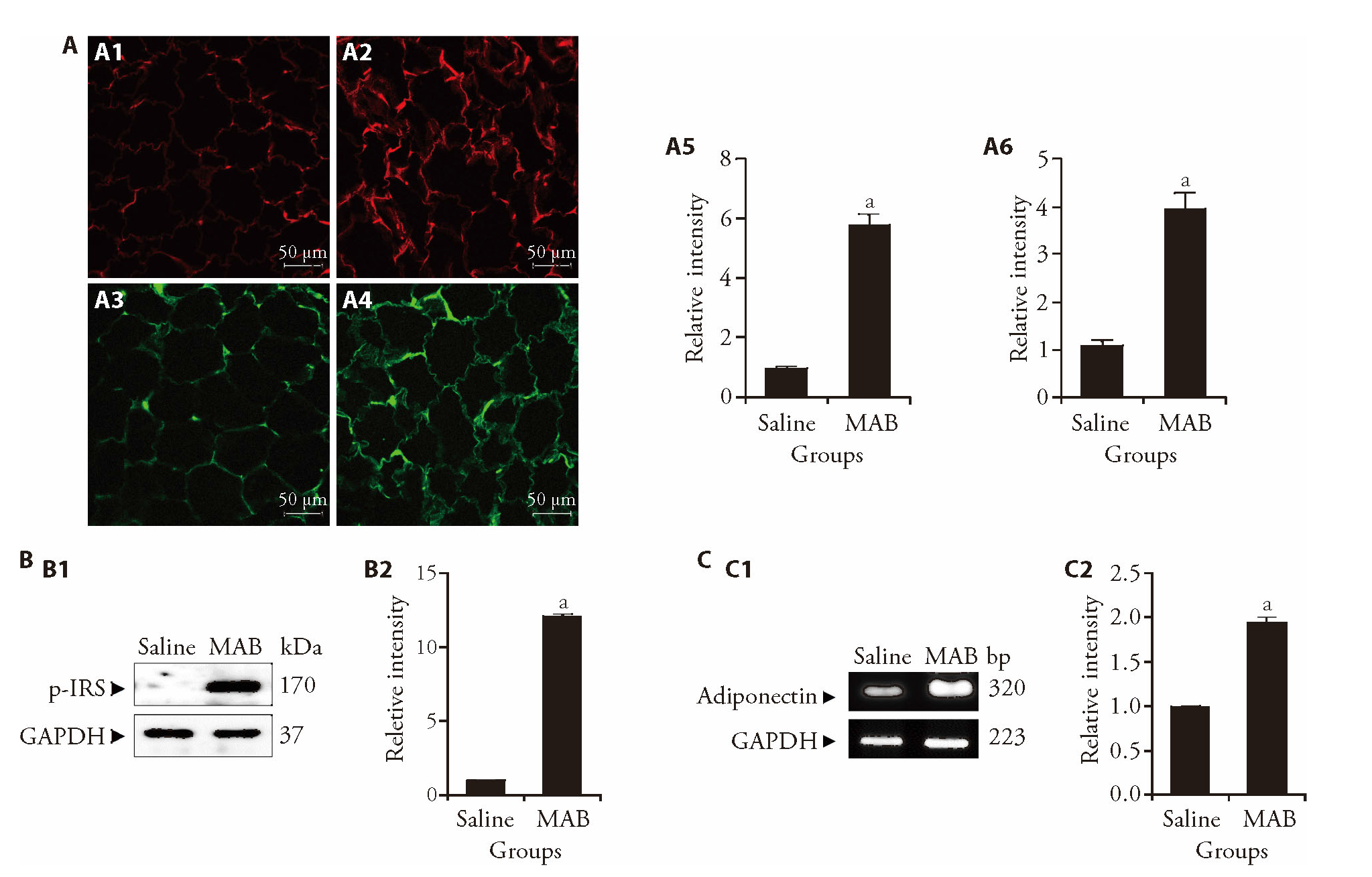 RESULTS: HFD-fed mice treated with local MAB topical injection showed reduced adipocyte weight and size in inguinal fat pads by dual-energy X-ray absorptiometry. No toxicity changes seen in liver, spleen, kidney tissue, or alanine aminotransferase / aspartate aminotransferase levels in serum by MAB injection. Protein levels of phosphorylated insulin receptor substrate-1 and glucose transporter type 4, and mRNA expression of adiponectin, were increased in inguinal adipose tissue injected with MAB locally. Locally MAB injection led to a decrease in glucose-6-phosphatase and phosphoenolpyruvate carboxykinase, linked to gluconeogenesis, while forkhead box protein O1, which regulates these factors, was increased. Moreover, there was an increase in adenosine 5‘-monophosphate-activated protein kinase, related to lipogenesis, as well as elevated levels of hormone-sensitive lipase and fatty acid synthase, both associated with lipolysis. These results support the 'insulin signaling pathway' and 'regulation of lipolysis in adipocytes' identified in the Kyoto Encyclopedia of Genes and Genomes pathway through network analysis.