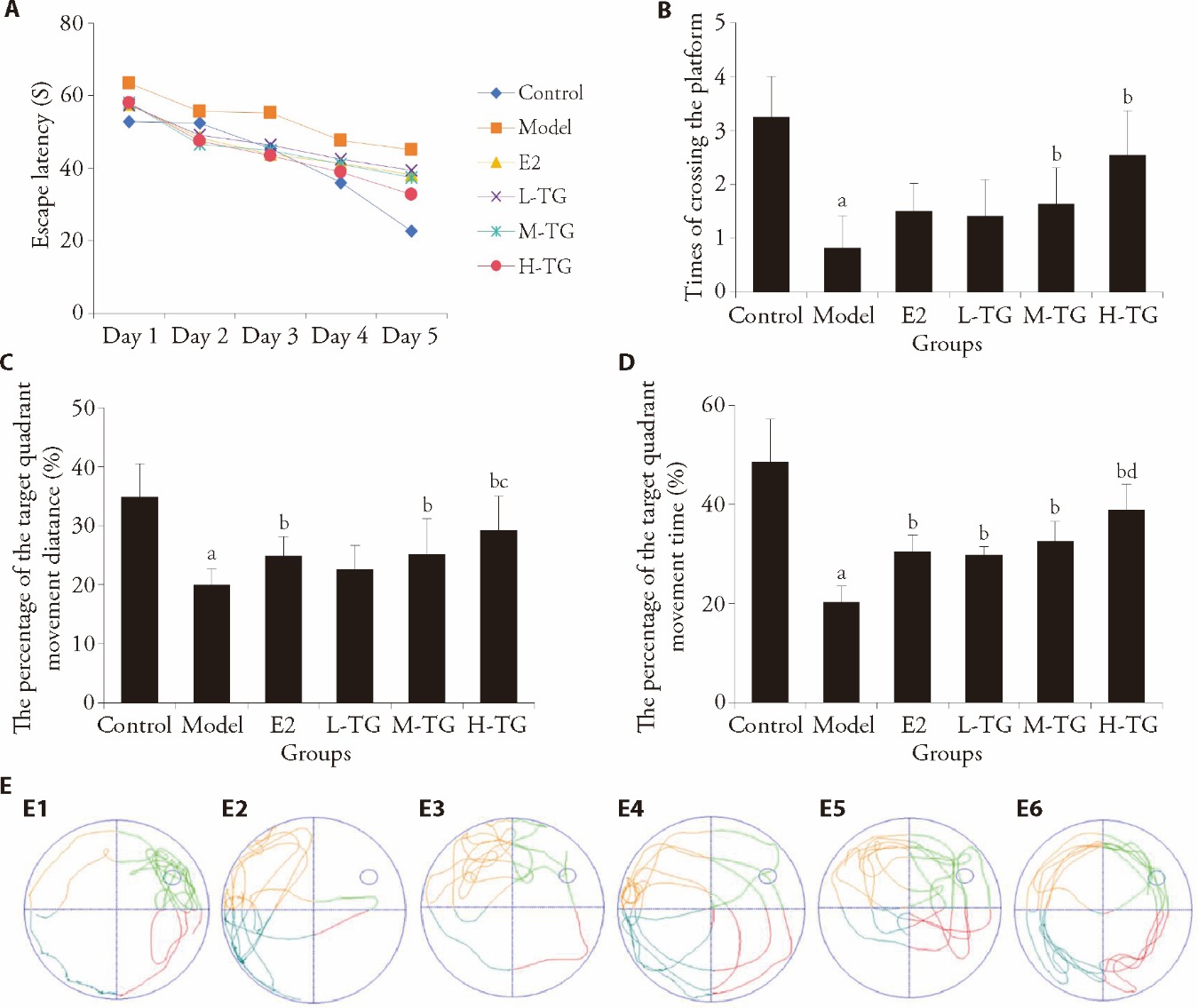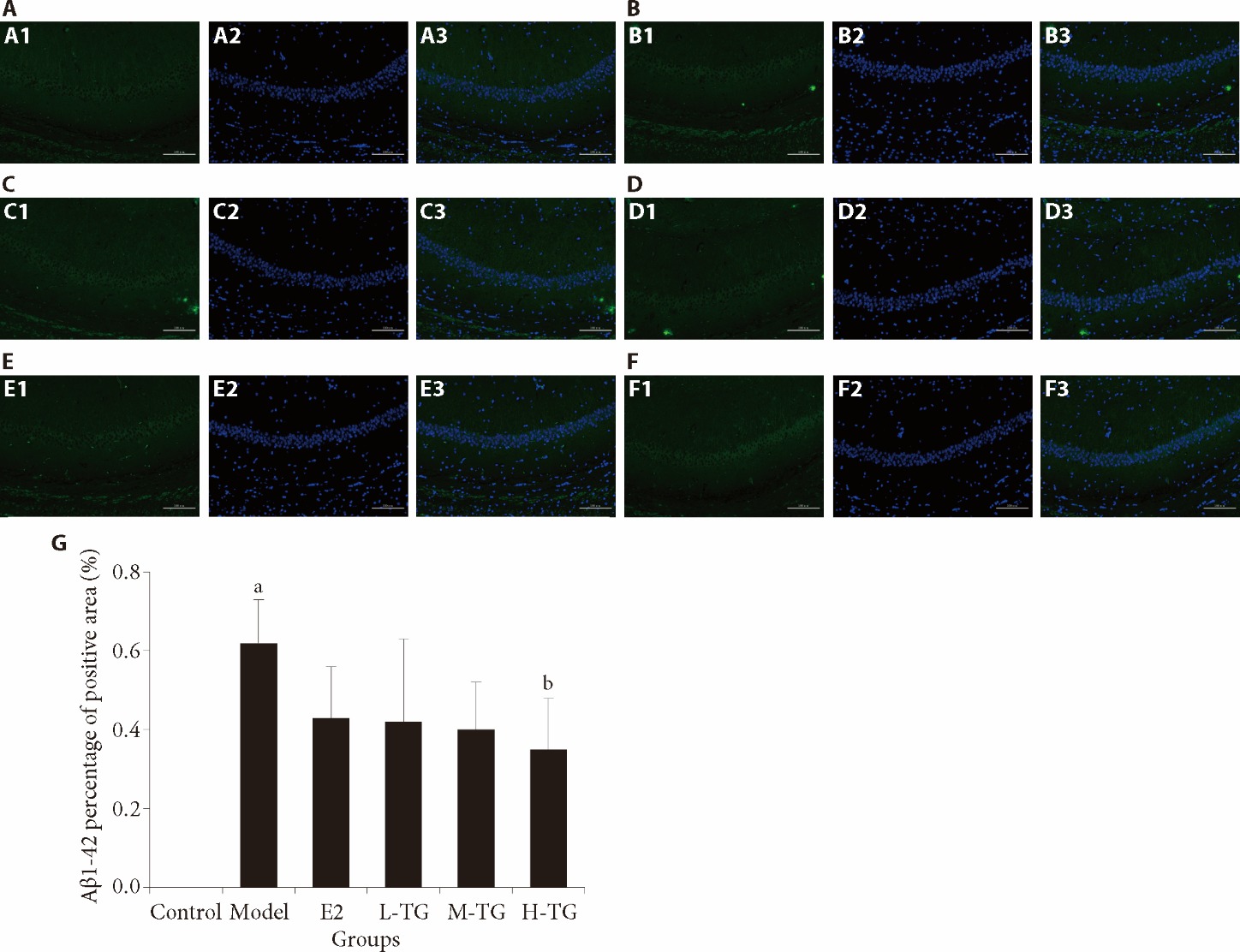 METHODS: Amyloid precursor protein/presenilin-1 (APP/PS1) transgenic female mice were randomly divided into model, estradiol valerate, low-, medium-, and high-dose TG groups, female C57 mice were used as the control group (n = 12/group). After 12 weeks of treatment, the behavior of mice was tested with the Morris water maze, and brain tissue samples were collected, and changes in hippocampal neurons were observed using electron microscopy. The deposition of beta-amyloid protein (Aβ) amyloid plaques in the hippocampus was determined by light microscopy. Aβ1-42 protein levels were detected through immunofluorescence. Oxidative stress indicators in the hippocampus were detected by enzyme linked immunosorbent assay. The expressions of nuclear factor-erythroid 2-related factor 2 (Nrf2), c-Jun N-terminal kinase (JNK), phospho-JNK (p-JNK), B-cell lymphoma-2 (Bcl-2), caspase-9, and cleaved caspase-9 were detected by Western blot. Hippocampal cell apoptosis was detected using the terminal deoxynucleotidyl transferase-mediated nick end Labeling.