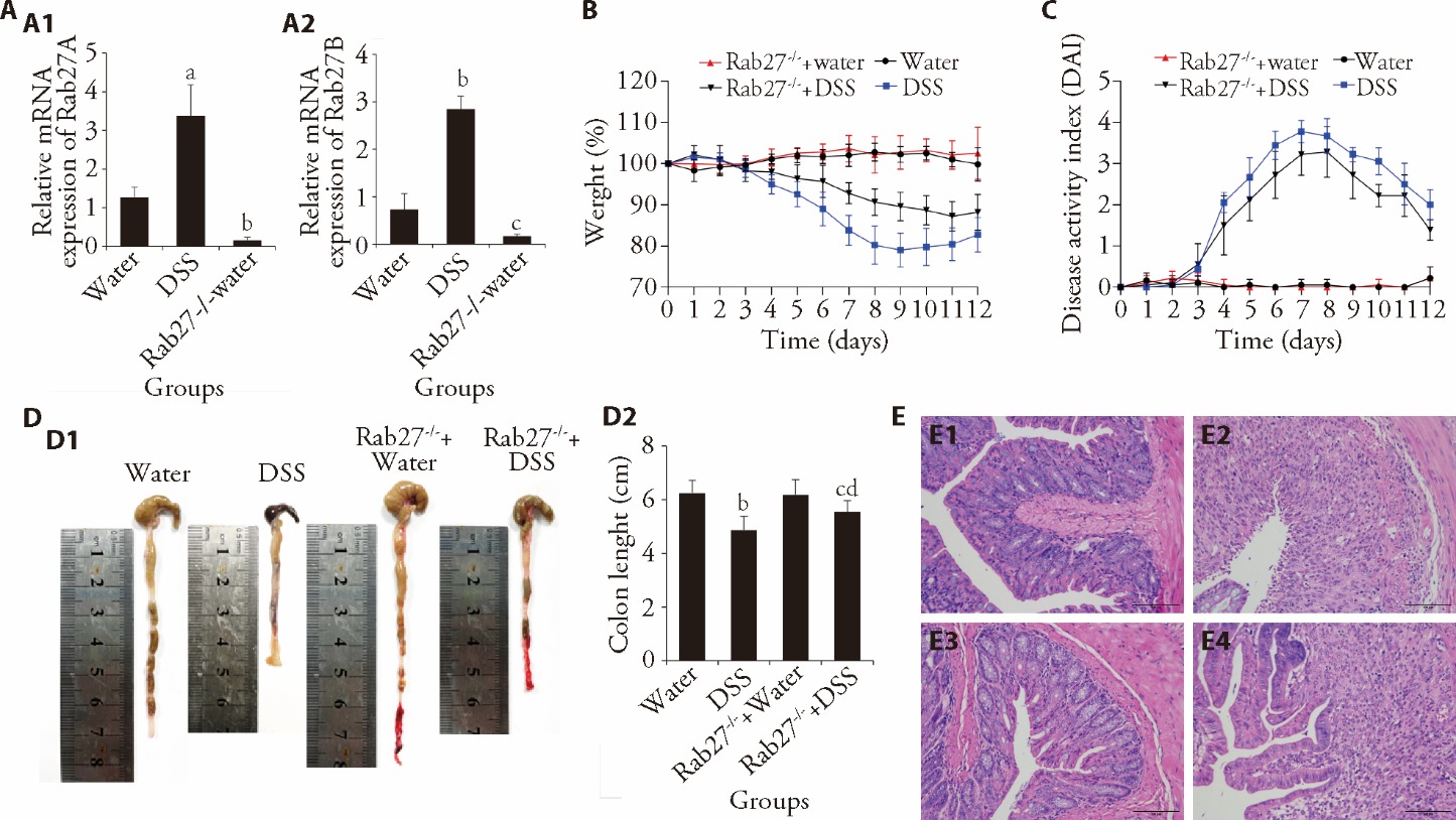 Figure 1 The intestinal inflammation of DSS-induced mice could be alleviated by Rab27 knockout A: mRNA expression (n = 3); A1: Rab27A; A2: Rab27B; B: weight change (n = 6); C: DAI scores (n = 6); D: colon length (n = 6); D1: measurement of the colon; D2: statistical graph of colon length; E: HE staining (scale bar: 100 μm × 200); E1: Water; E2: DSS; E3: Rab27-/-+Water; E4: Rab27-/-+DSS; Water: control group; DSS: ulcerative colitis group; Rab27-/-+Water: Rab27 knock out mice with normal drinking water; Rab27-/-+DSS: Rab27 knock out mice with ulcerative colitis. DAI: disease activity index; HE: hematoxylin and eosin. One-way analysis of variance was utilized. Results are presented as mean ± standard deviation. aP < 0.01, cP < 0.05 vs water; bP < 0.001, dP < 0.05 vs DSS.