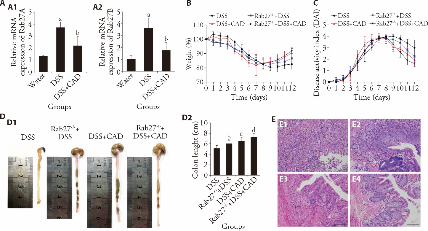Figure 3 The inflammation of DSS-induced mice could be alleviated by CAD via affecting Rab27 A: mRNA expression (n = 3); A1: Rab27A; A2: Rab27B; B: weight change (n = 6); C: DAI scores (n = 6); D: colon length (n = 6); D1: measurement of colon; D2: statistical graph of colon length; E: HE staining (scale bar: 100 μm × 200); E1: DSS; E2: Rab27-/- + DSS; E3: DSS + CAD; E4: Rab27-/- + DSS + CAD; DSS: ulcerative colitis group; Rab27-/- + DSS: Rab27 knock out mice with ulcerative colitis; DSS + CAD: ulcerative colitis mice with high-dose Chang’an decoction (26 g·kg-1·d-1); Rab27-/- + DSS + CAD: Rab27 knock out mice with ulcerative colitis were given high-dose Chang’an decoction (26 g·kg-1·d-1); CAD: Chang’an decoction. The drug was administered for 6 d. DAI: disease activity index; HE: hematoxylin and eosin; PCR: polymerase chain reaction. One-way analysis of variance was utilized. Results are presented as mean ± standard deviation. aP < 0.01 vs water, bP < 0.05 vs DSS, cP < 0.01 vs DSS, dP < 0.001 vs DSS.