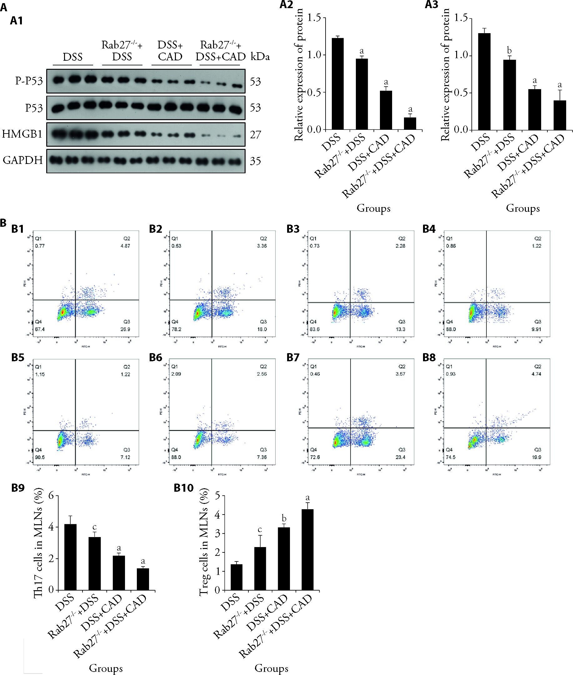 Figure 4 Th17/Treg balance could be regulated by CAD via effecting Rab27 in P53/HMGB1 pathway A: protein expression levels of P-P53, P53 and HMGB1 in colon tissues (n = 3); A1: protein band; A2: statistical graph of HMGB1; A3: statistical graph of P-P53; B: number of Th17 and Treg cells in mesenteric lymph nodes of each group (n = 3). B1:Th17 cells in the DSS group; B2: Th17 cells in the Rab27-/- + DSS group; B3: Th17 cells in the DSS + CAD group; B4: Th17 cells in the Rab27-/- + DSS + CAD group; B5: Treg cells in the DSS group; B6: Treg cells in the Rab27-/- + DSS group; B7: Treg cells in the DSS + CAD group; B8: Treg cells in the Rab27-/- + DSS + CAD group; B9: statistical graph of Th17 cells; B10: statistical graph of Treg cells; DSS: ulcerative colitis group; Rab27-/- + DSS: Rab27 knock out mice with ulcerative colitis; DSS + CAD: ulcerative colitis mice with high-dose Chang’an decoction (26 g·kg-1·d-1); Rab27-/- + DSS + CAD: Rab27 knock out mice with ulcerative colitis were given high-dose Chang’an decoction (26 g·kg-1·d-1); CAD: Chang’an decoction (26 g·kg-1·d-1). The drug was administered for 6 d. HMGB1: high mobility group box 1; P-P53: phospho- P53; IL-17: interleukin 17; IL-21: interleukin 21; IL-22: interleukin 22; TGF-β: transforming growth factor β; IL-10: interleukin 10; PCR: polymerase chain reaction; MLNs: mesenteric lymph nodes; UC: ulcerative colitis; Th17: T helper 17 cells; Treg: regulatory T cells; NF-κB: nuclear factor kappa-B. One-way analysis of variance was utilized. Results are presented as mean ± standard deviation. aP < 0.05, bP < 0.01, cP < 0.001 vs DSS.