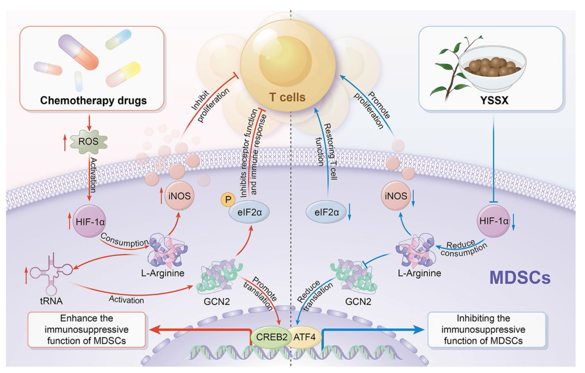 Figure 4 YSSX improves the modulation of MDSCs-mediated immunosuppression after chemotherapy Chemotherapeutic agents triggered ROS accumulation, recruiting and activating MDSCs, whose high expression of HIF-1α promoted L-arginine depletion, followed by the release of iNOS, affecting T cell proliferation. Meanwhile, GCN2 senses L-arginine depletion activation and promotes eIF2α phosphorylation, which in turn inhibits T cell immune response, and in turn promotes increased translation of CREB2/ATF4, enhancing MDSCs activity (left). After YSSX intervention, HIF-1α transcription was blocked, and then L-arginine depletion was reduced, iNOS production was decreased, and T-cell proliferation was enhanced. reduced L-arginine depletion, GCN2 activity was reduced, and eIF2α phosphorylation was inhibited, which promoted T-cells to perform their normal immune functions; at the same time, due to the reduction in GCN2 expression mediating the reduction of CREB2/ATF4 translation, the activity of MDSCs was also inhibited (right). YSSX: Yishui Shengxue pills; ATF4: activating transcription factor 4; eIF2α: eukaryotic translation initiation factor 2α; iNOS: inducible nitric oxide synthase; HIF-1α: hypoxia-inducible factor-1α; GCN2: general control nonderepressible 2; GCN2: general control nonderepressible 2; CREB2: cAMP response element-binding protein 2; ATF4: activating transcription factor 4. This image was created by Adobe Illustr (San Jose, CA, USA).