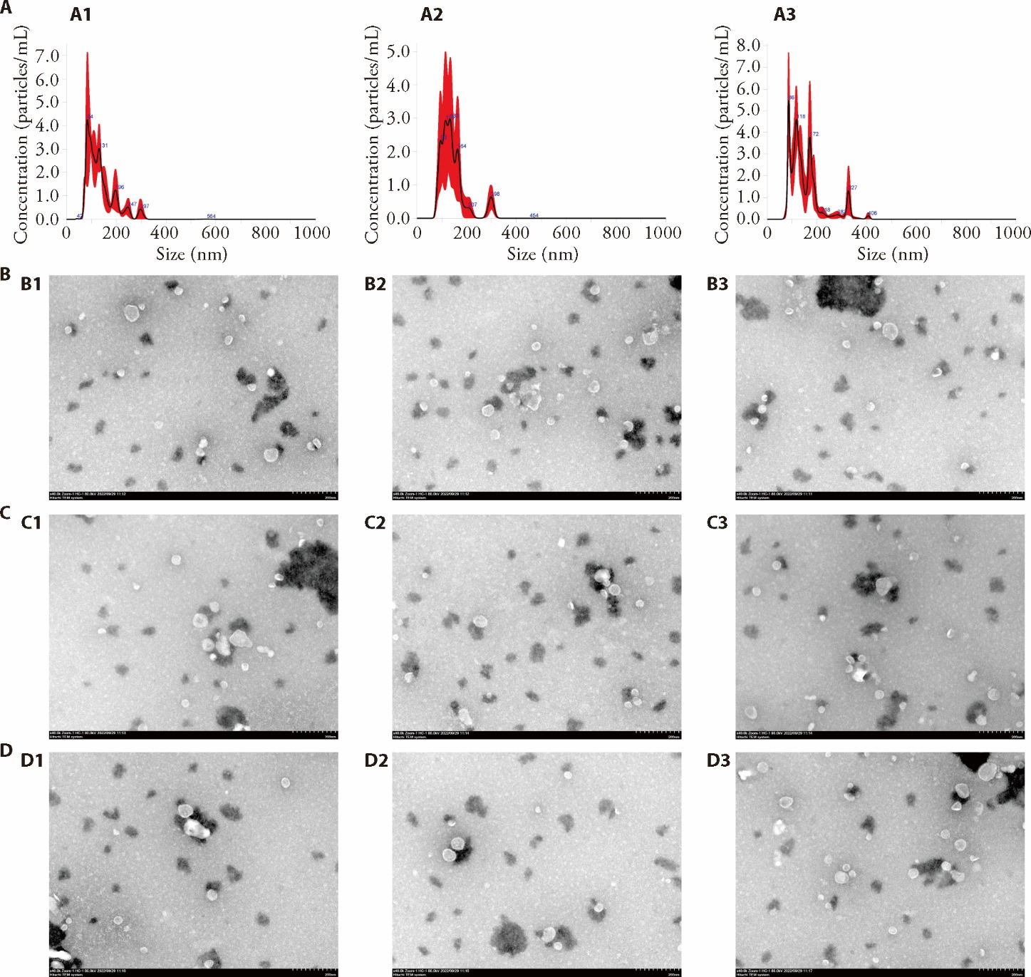 Figure 1 Evaluation of the quality of exosomes A: size distribution of plasma exosomes assessed using NTA; A1: Control; A2: T2DM; A3: T2DM + EA; B: morphological appearance of plasma exosomes under a transmission electron microscope (Control); B1: Control-1; B2: Control-2; B3: Control-3; C: morphological appearance of plasma exosomes under a transmission electron microscope (T2DM); C1:T2DM-1; C2:T2DM-2; C3:T2DM-3; D: morphological appearance of plasma exosomes under a transmission electron microscope (T2DM + EA); D1: T2DM + EA-1; D1: T2DM + EA-1; D1: T2DM + EA-1. NTA: nanoparticle tracking analysis; T2DM: type 2 diabetes; EA: electroacupuncture. Control (low-fat diet), T2DM (HFD + STZ 50 mg/kg), and T2DM + EA (T2DM mice treated with electroacupuncture at ST36 and BL20 for 4 weeks). Briefly, for the mice in the T2DM model + EA group, the acupuncture Zusanli (ST36) and Pishu (BL20) points (frequency 2 Hz, intensity 1-3 mA, intermittent waveform, serial length 30 s, increasing once every 5 min, lasting for 15 min) were stimulated once every 2 d, 3 times a week, for 4 weeks (12 times in total). Before EA treatment, T2DM mice were under 2% isoflurane anesthesia.
