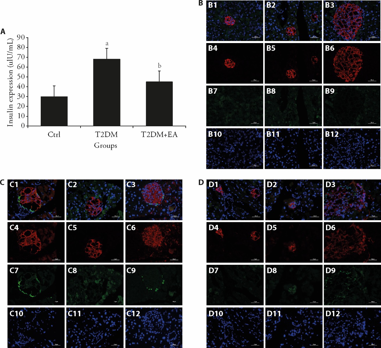 Figure 2 EA treatment reduced the insulin level and cell apoptosis in pancreatic tissue of T2DM A: serum insulin level detected using ELISA; B: immunofluorescence analysis of insulin and c-caspase 3 expression in pancreatic tissue; C: immunofluorescence analysis of insulin and c-caspase 3 expression in pancreatic tissue; D: immunofluorescence analysis of insulin and c-caspase 3 expression in pancreatic tissue; B1, C1, D1: merge-1; B2, C2, D2: merge-2; B3, C3, D3: merge-3; B4, C4, D4: insulin-1; B5, C5, D5: insulin-2; B6, C6, D6: insulin-3; B7, C7, D7: c-caspase3-1; B8, C8, D8: c-caspase3-2; B9, C9, D9: c-caspase3-3; B10, C10, D10: DAPI-1; B11, C11, D11: DAPI-2; B12, C12, D12: DAPI-3; D1: merge-1; D2: merge-2; D3: merge-3; D4: insulin-1; D5: insulin-2; D6: insulin-3; D7: c-caspase3-1; D8: c-caspase3-2; D9: c-caspase3-3; D10: DAPI-1; D11: DAPI-2; D12: DAPI-3. Control (low-fat diet), T2DM (HFD + STZ), and T2DM + CircEZH1-siRNA (T2DM mice administered CircEZH1-siRNA, 20 nmol/20 g). Briefly, for the mice in the T2DM model + EA group, the acupuncture Zusanli (ST36) and Pishu (BL20) points (frequency 2 Hz, intensity 1-3 mA, intermittent waveform, serial length 30 s, increasing once every 5 min, lasting for 15 min) were stimulated once every 2 d, 3 times a week, for 4 weeks (12 times in total). Before EA treatment, T2DM mice were under 2% isoflurane anesthesia. T2DM: type 2 diabetes, EA: electroacupuncture; ELISA: enzyme-linked immunosorbent assay; DAPI: 4′,6-diamidino-2-phenylindole; ANOVA: analysis of variance. The statistical analyses included one-way ANOVA and t-tests to compare differences among treatment groups. Error bars represent the mean?± standard deviation (n = 3). Compared with the ctrl group, aP < 0.001; compared with T2DM group, bP < 0.05.