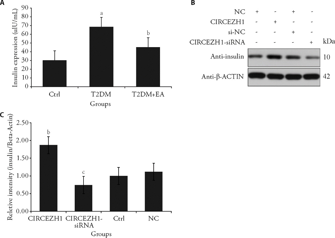 Figure 3 Effect of CircEZH1 expression on the insulin level in Min6 cells A: insulin level in Min6 cell supernatant detected using ELISA. Control (low-fat diet), T2DM (HFD + STZ 50 mg/kg), and T2DM + EA (T2DM mice treated with electroacupuncture at ST36 and BL20 for 4 weeks); B: representative band of insulin protein in in Min6 cells detected using Western blotting; C: relative protein levels of insulin results. Control (scramble siRNA or empty vector), CircEZH1 overexpression, CircEZH1 knockdown (CircEZH1 siRNA) and NC (Min6 cell without CircEZH1overexpression). HFD: high-fat diet; STZ: streptozotocin; T2DM: type 2 diabetes mellitus; EA: electroacupuncture; ST36: Zusanli acupoint; BL20: Pishu acupoint; siRNA: Small interfering RNA; CircEZH1: Circular RNA enhancer of zeste homolog 1. Briefly, for the mice in the T2DM model + EA group, the acupuncture Zusanli (ST36) and Pishu (BL20) points (frequency 2 Hz, intensity 1-3 mA, intermittent waveform, serial length 30 s, increasing once every 5 min, lasting for 15 min) were stimulated once every 2 d, 3 times a week, for 4 weeks (12 times in total). Before EA treatment, T2DM mice were under 2% isoflurane anesthesia. OE-NC: Min6 cell without CircEZH1overexpression; CircEZH1: circular RNA of Enhancer of Zeste Homolog 1; ELISA: enzyme-linked immunosorbent assay; ANOVA: analysis of variance. Error bars represent the mean?±?standard deviation (n = 3). Compared with OE-NC group, aP < 0.05, bP < 0.001; compared with siRNA-NC group, cP < 0.0.05. The statistical analyses included one-way ANOVA and t-tests to compare differences among treatment groups.