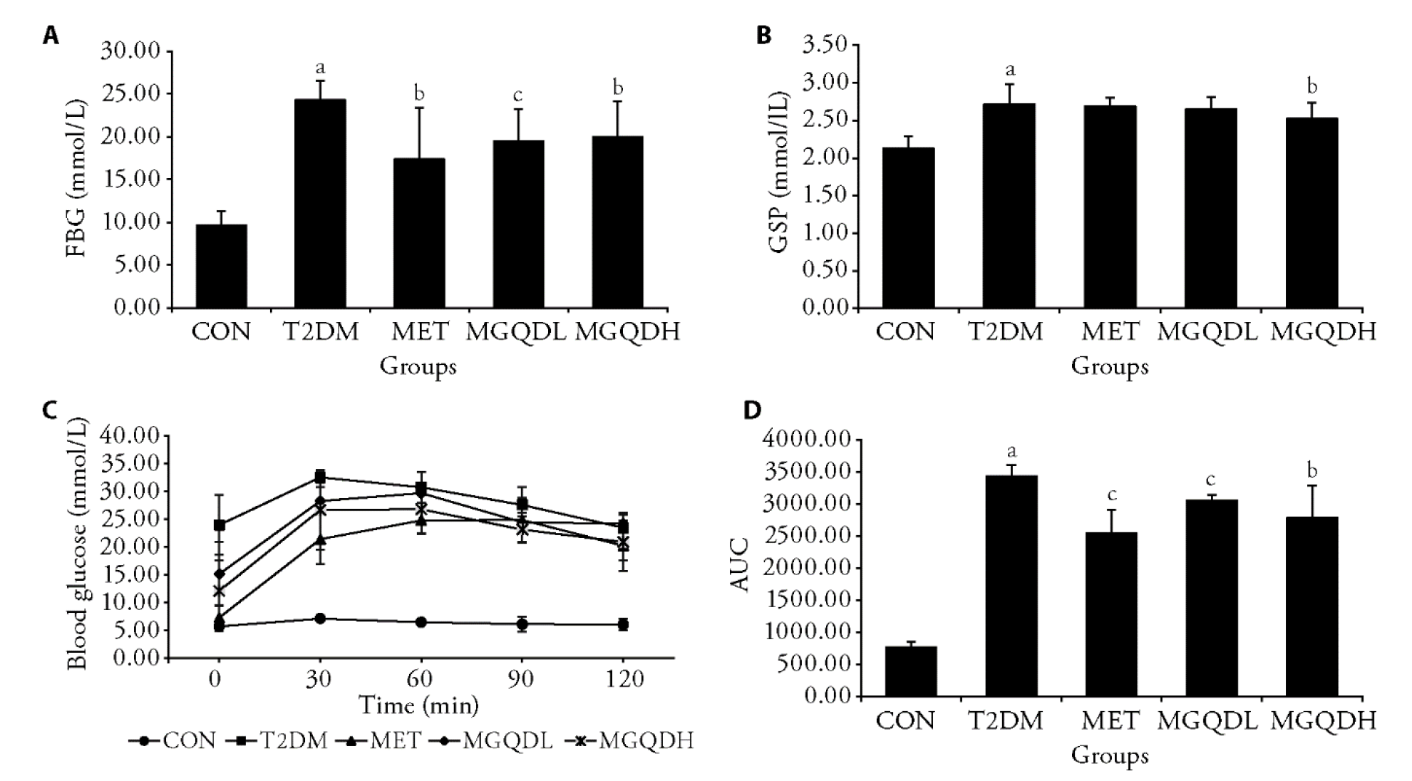 Figure 1 Blood glucose and glucose tolerance test in serum of each group A: FBG; B: GSP; C: glucose tolerance test; D: AUC. CON: normal rats treated with control diet and normal saline; T2DM: diabetic rats treated with high-fat diet and normal saline. MET: diabetic rats treated with high-fat diet and 200 mg·kg?1·d?1 of metformin hydrochloric acid for 14 weeks; MGQDL: diabetic rats treated with high-fat diet and 5 g·kg?1·d?1 of MGQD for 14 weeks; MGQDH: diabetic rats treated with high-fat diet and 10 g·kg?1·d?1 of MGQD for 14 weeks. CON: control; T2DM: type 2 diabetes mellitus; MET: metformin; MGQDL: low-dose Modified Gegen Qinlian decoction; MGQDH: high-dose Modified Gegen Qinlian decoction; FBG: fasting blood glucose; GSP: glycosylated serum protein; AUC: area under curve. The data were expressed as mean ± standard deviation. The Shapiro-Wilk test was used to determine if a distribution was normal or not. Statistical differences between treatments were analyzed using a one-way analysis of variance or Mann-Whitney U test (n = 7-10 for FBG and GSP, n = 6 for glucose tolerance test). aP < 0.01 vs the CON group; bP < 0.05, cP < 0.01 vs the T2DM group.