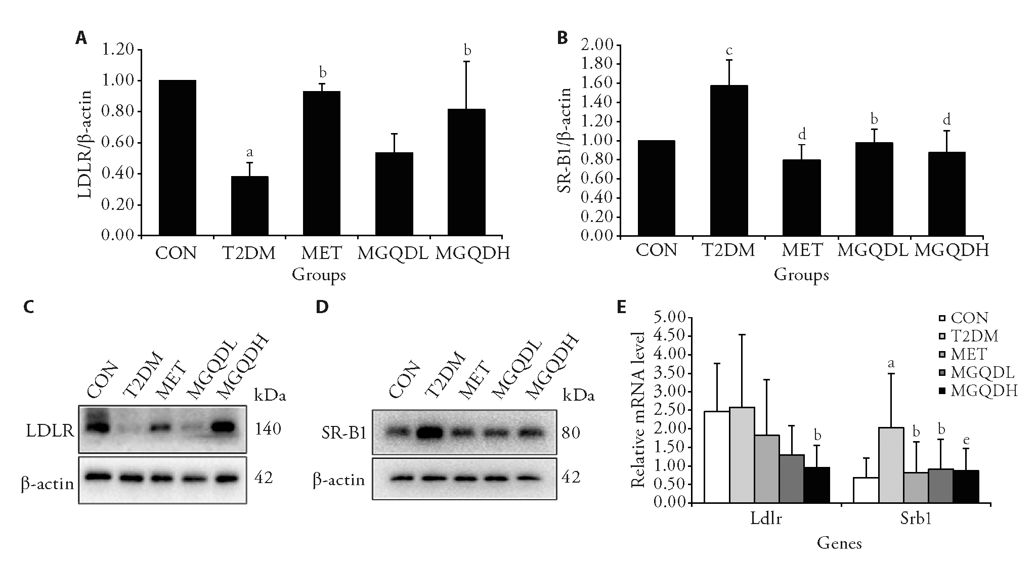 Figure 2 Protein and mRNA levels of LDLR and SR-B1 in eWAT of each group A: relative protein expression of LDLR; B: relative protein expression of SR-B1; C: protein images of LDLR; D: protein images of SR-B1; E: relative mRNA levels of Ldlr and Srb1 were detected by qPCR.CON: normal rats treated with control diet and normal saline; T2DM: diabetic rats treated with high-fat diet and normal saline. MET: diabetic rats treated with high-fat diet and 200 mg·kg?1·d?1 of metformin hydrochloric acid for 14 weeks; MGQDL: diabetic rats treated with high-fat diet and 5 g·kg?1·d?1 of MGQD for 14 weeks; MGQDH: diabetic rats treated with high-fat diet and 10 g·kg?1·d?1 of MGQD for 14 weeks. CON: control; T2DM: type 2 diabetes mellitus; MET: metformin; MGQDL: low-dose modified Gegen Qinlian decoction; MGQDH: high-dose modified Gegen Qinlian decoction; eWAT: epididymal adipose tissue; LDLR: low-density lipoprotein receptor; SR-B1: scavenger receptor class B type 1; Ldlr: the gene encoding LDLR; Srb1: the gene encoding SR-B1; qPCR: quantitative real-time polymerase chain reaction. The data measured in this research were expressed as mean ± standard deviation. Statistical differences between treatments were analyzed using a one-way analysis of variance (n = 3 for protein levels and n = 5-10 for mRNA levels). aP < 0.01, cP < 0.05 vs the CON group; bP < 0.05, dP < 0.01, and eP = 0.059 vs the T2DM group.