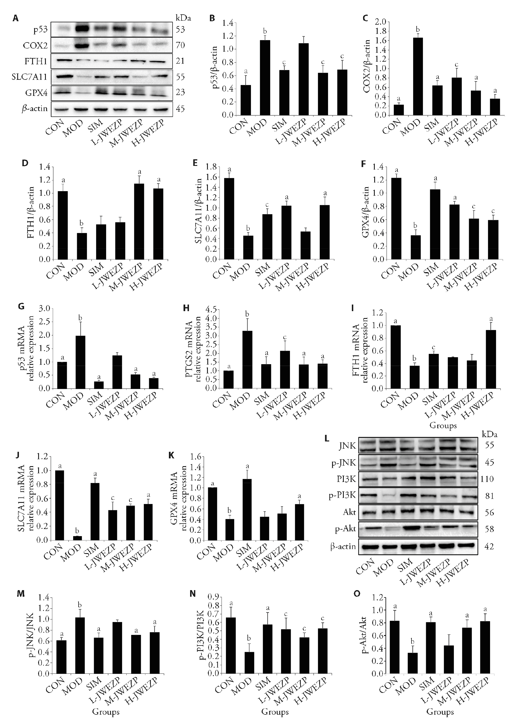 Figure 4 JWEZP inhibits ferroptosis via p53, MAPK and PI3K/Akt signaling pathways against AS A: protein expression of p53 signaling pathway; B: protein expression of p53; C: protein expression of COX2; D: protein expression of FTH1; E: protein expression of SLC7A11; F: protein expression of GPX4; G: mRNA expression of p53; H: mRNA expression of PTGS2; I: mRNA expression of FTH1; J: mRNA expression of SLC7A11; K: mRNA expression of GPX4; L: protein expression of MAPK and PI3K/Akt signaling pathways; M: protein expression of p-JNK/JNK; N: protein expression of p-PI3K/PI3K; O: protein expression of p-Akt/Akt. CON: treated only with physiological saline; MOD: treated only with physiological saline; SIM: treated with simvastatin by gavage (2.6 mg·kg?1·d?1); L-JWEZP: treated with low-dose Jiawei Erzhi pill by gavage (3.9 g·kg?1·d?1); M-JWEZP: treated with medium-dose Jiawei Erzhi pill by gavage (7.8 g·kg?1·d?1); H-JWEZP: treated with high-dose Jiawei Erzhi pill by gavage (15.6 g·kg?1·d?1). CON: control group; MOD: model group; SIM: simvastatin group; L-JWEZP: low-dose Jiawei Erzhi pill; M-JWEZP: medium-dose Jiawei Erzhi pill; H-JWEZP: high-dose Jiawei Erzhi pill; COX2: cyclooxygenase-2; FTH1: ferritin heavy chain 1; SLC7A11: solute carrier family 7 member 11; GPX4: glutathione peroxidase 4; JNK: c-Jun N-terminal kinase; PI3K: phosphatidylinositol 3-kinase; Akt: protein Kinase B; MAPK: mitogen-activated protein kinase. The results are expressed as mean ± standard deviation (n = 3), and the groups were compared using one-way analysis of variance. aP < 0.01, compared with model group; bP < 0.01, compared with control group; cP < 0.05, compared with model group.