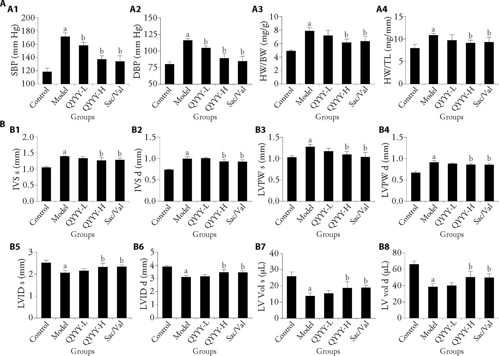 Figure 1 QYYY alleviates hypertension and improves cardiac architecture in a hypertensive mouse model A: effects of QYYY on blood pressure and cardiac hypertrophy indices after 4 weeks of administration; A1: SBP; A2: DBP; A3: HW/BW; A4: HW/TL; B: quantification of echocardiographic parameters of mice from each group; B1: IVS s; B2: IVS d; B3: LVPW s; B4: LVPW d; B5: LVID s; B6: LVID d; B7: LV Vol s; B8: LV Vol d. QYYY-L: the mice received QYYY at a dose of 2.6 g/kg once every day for 4 weeks; QYYY-H: the mice received QYYY at a dose of 5.2 g/kg once every day for 4 weeks; Sac/Val: the mice received sacubitril/valsartan at a dose of 13 mg/kg once every day for 4 weeks. QYYY: Qianyang Yuyin granule; SBP: systolic blood pressure; DBP: diastolic blood pressure; HW/BW: heart weight to body weight; HW/TL: heart weight to tibia length; IVS: interventricular septum; LVID: left ventricular internal dimension; LVPW: left ventricular posterior wall; LV Vol: left ventricular volume; s: systole; d: diastole. The data were expressed as mean ± standard deviation (n = 6) and analyzed using one-way analysis of variance with Dunnett's post hoc test. aP < 0.05 vs control group; bP < 0.05 vs model group.