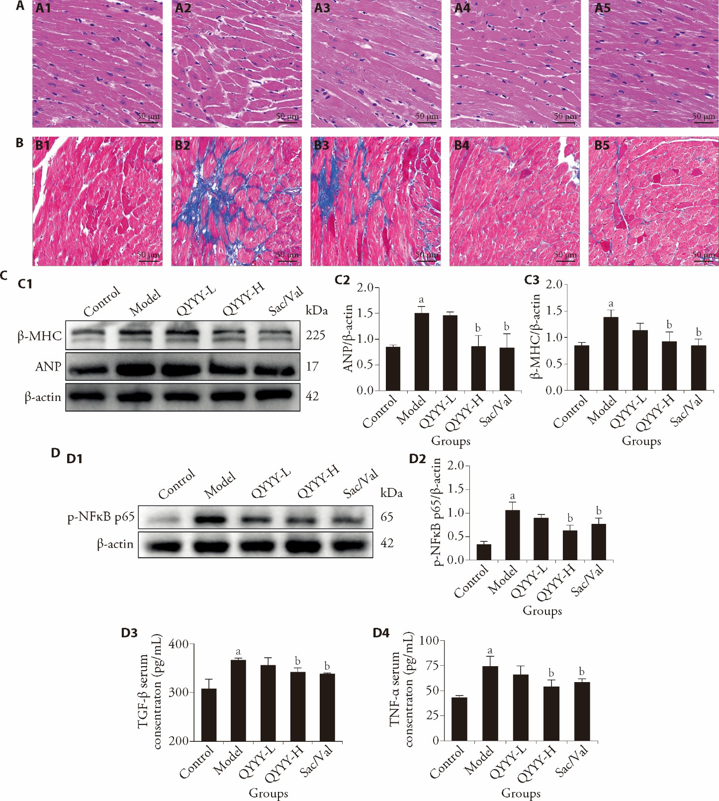 Figure 2 QYYY attenuated hypertensive cardiac remodeling and inflammation A: representative images of cardiac tissue sections stained with HE; B: representative images of cardiac tissue sections stained with Masson's trichrome; Scale bars = 50 µm; C1: Western blot analysis of β-MHC and ANP; C2: protein expression of β-MHC; protein expression of ANP; D1: Western blot analysis of p-NF-κB p65; D2: quantification of relative protein expression of p-NF-κB p65; D3: serum levels of TGF-β measured by ELISA; D4: serum levels of TNF-α measured by ELISA. A1, B1: Control group; A2, B2: Model group; A3, B3: QYYY-L group; A4, B4: QYYY-H group; A5, B5: Sac/Val group. QYYY-L: the mice received QYYY at a dose of 2.6 g/kg once every day for 4 weeks; QYYY-H: the mice received QYYY at a dose of 5.2 g/kg once every day for 4 weeks; Sac/Val: the mice received sacubitril/valsartan at a dose of 13 mg/kg once every day for 4 weeks. QYYY: Qianyang Yuyin granule; HE: hematoxylin-eosin; ANP: atrial natriuretic peptide; β-MHC: myosin heavy chain beta; p-NF-κB p65: phospho-NF-kappa B p65; TNF-α: tumor necrosis factor-α; TGF-β: tumor necrosis factor-β; ELISA: enzyme-linked immunosorbent assay. The data were expressed as mean ± standard deviation (n = 3) and analyzed using one-way analysis of variance with Dunnett's post hoc test. aP < 0.05 vs control group; bP < 0.05 vs model group.