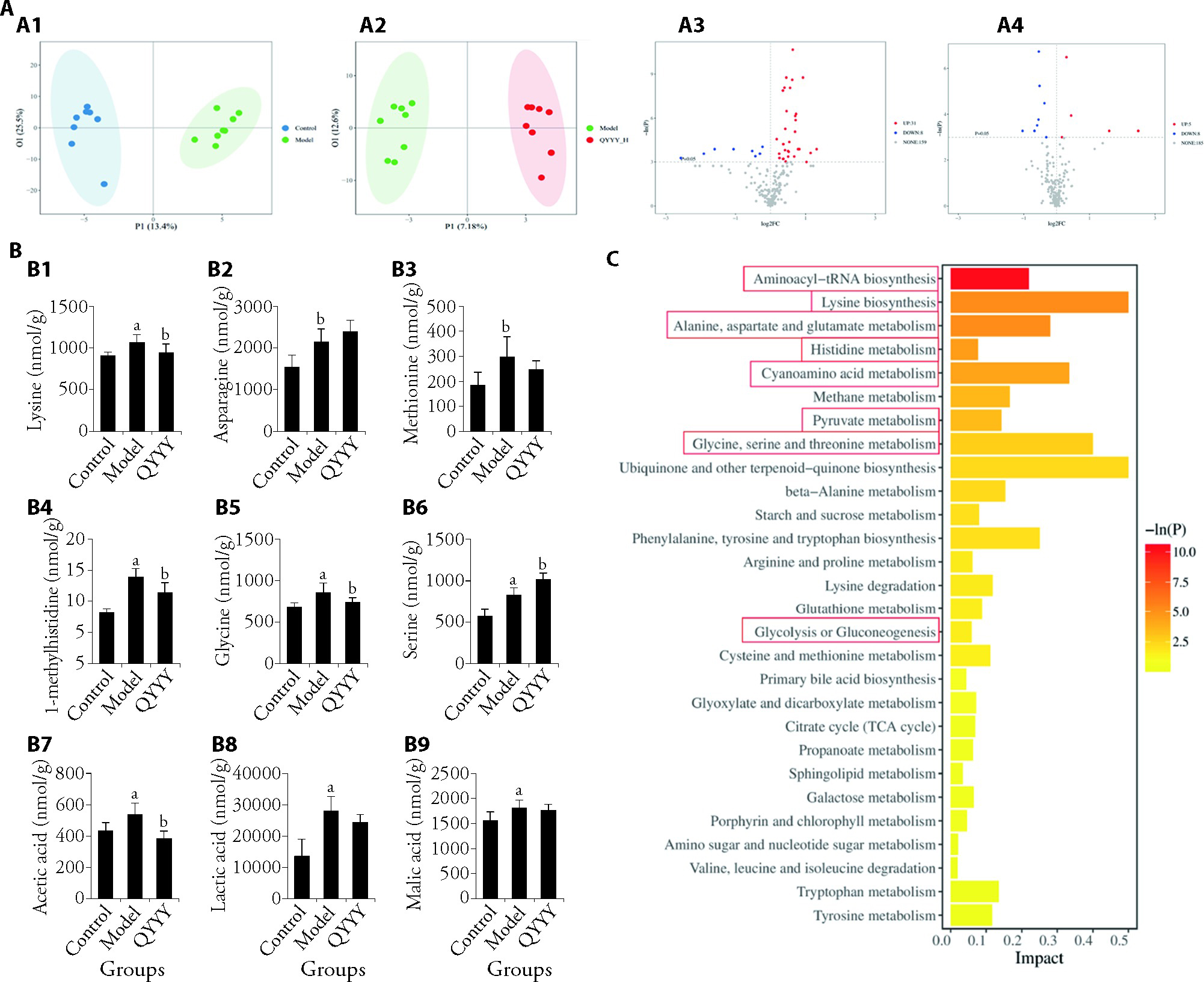 Figure 3 QYYY reshaped the metabolic balance of Ang Ⅱ infused mice A: OPLS-DA between different groups and differential metabolite screening presented as volcano plots (P < 0.05, |log2FC| > = 0); A1: OPLS-DA between control group and model group; A2: OPLS-DA between model group and QYYY-H group; A3: volcano plots between control group and model group; A4: volcano plots between model group and QYYY-H group; B: contents of nine DEMs in the mouse heart; B1: lysine; B2: asparagine; B3: methionine; B4: 1-methylhistidine; B5: glycine; B6: serine; B7: acetic acid; B8: lactic acid; B9: malic acid; C: pathway analysis of DEMs, the red boxes represent the pathways enriched by the 9 differential metabolites in Figure 3B. QYYY-H: the mice received QYYY at a dose of 5.2 g/kg once every day for 4 weeks. QYYY: Qianyang Yuyin granule; OPLS-DA: orthogonal projections to latent structures-discriminant analysis; DEMs: differential expressed metabolites. The data were expressed as mean ± standard deviation (n = 8) and analyzed using one-way analysis of variance with Dunnett's post hoc test. aP < 0.05 vs control group; bP < 0.05 vs model group.
