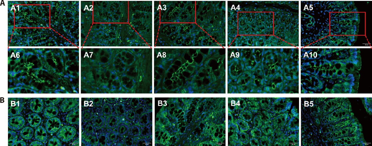 Figure 2 JLD protected the intestinal barrier in HFD-induced obese rats A: immunofluorescence of colonic ZO-1 (× 40 and × 80, scale bar = 40 μm); B: immunofluorescence of colonic Claudin-1 (× 40, scale bar = 40 μm). A1, B1: Control group; A2, B2: HFD group; A3, B3: L-JLD group; A4, B4: H-JLD group; A5, B5: Sitagliptin group. Control: fed with normal food + the same volume of 5% CMC was given by gavage for 25 weeks; HFD: fed with HFD + the same volume of 5% CMC was given by gavage for 25 weeks; L-JLD: fed with HFD + received an intragastric administration of JLD at a dosage of 1.5 g·kg?1·d?1 for 25 weeks; H-JLD: fed with HFD + received an intragastric administration of JLD at a dosage of 3 g·kg?1·d?1 for 25 weeks; Sitagliptin: fed with HFD + received an intragastric administration of sitagliptin at a dosage of 10 mg·kg?1·d?1 for 25 weeks. JLD: Jinlida granules; HFD: high-fat diet; ZO-1: zonula occludens-1; CMC: carboxymethyl cellulose; L-JLD: low dose Jinlida; H-JLD: high dose Jinlida.