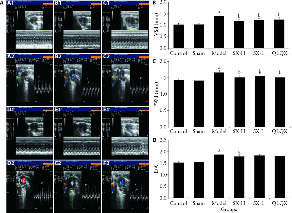 RESULTS: Compared to the model group, the thickness of the interventricular septum at the end of diastole (IVSd) and the thickness of the posterior wall at the end of diastole (PWd) of the Shunxin decoction high-dose group, Shunxin decoction low-dose group, and Qiliqiangxin capsule group were all significantly reduced (P < 0.01). Furthermore, Shunxin decoction high-dose group E/A value was decreased (P < 0.01). Compared to the model group, the expression of NPRA and GC increased in the Shunxin decoction low-dose group and the Qiliqiangxin capsule group (P < 0.01). Compared to the model group, the expressions of eNOS and PKG I increased (P < 0.05) in the Shunxin decoction high-dose group. The expression of PDE5A expression decreased in the myocardium of the Shunxin decoction high-dose group, Shunxin decoction low-dose group, and Qiliqiangxin capsule group compared to the model group (P < 0.01).