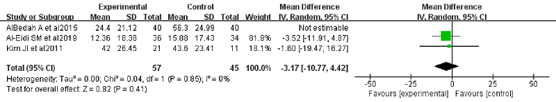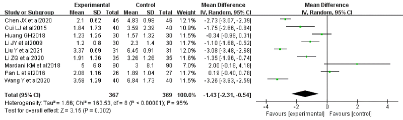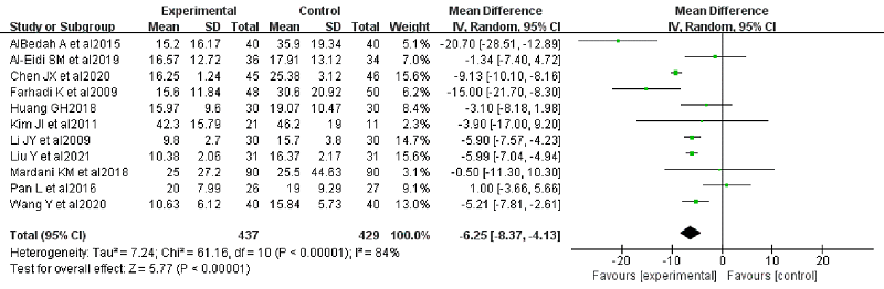 RESULTS: A total of 13 thirteen RCTs included a total of 1088 subjects. The visual analogue scale scores indicated that blood pricking and cupping was superior to the other treatments at relieving NLBP pain [mean difference (MD) = –1.43; 95% confidence interval (CI): –2.31 to 0.54; Z = 3.15; P = 0.002). The Oswestry Disability Index score of blood pricking and cupping was superior to that of the control group in terms of improving NLBP dysfunction (MD = –6.25; 95%CI: –8.37 to –4.31); Z = 5.77; P < 0.000 01). 7 RCTs mentioned no adverse reactions, while one study reported mild syncope [7% (n = 3), all in the 17-30 years group] that was gradually relieved after rest.