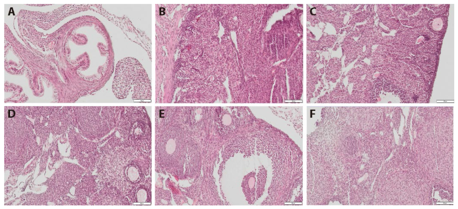 Figure 1 HE stained ovarian sections of each group A: control group; B: model group; C: premarin group; D: low of HLD groups; E: moderate of HLD groups; F: high dose of HLD group. Mice in the model, premarin, and HLD groups were administered a loading dose of CTX (100 mg·kg-1·d-1) followed by daily injections for 2 weeks, and then, positive group treated with premarin (0.03 mg/kg) once daily for 4 weeks. Control and model group received the same volume of distilled water, low (2 g/kg), moderate (5 g/kg, the dose used in vivo in human studies), and high (10 g/kg) dose of HLD groups treated by gastrogavage once daily for 4 weeks. Stained with HE, the numbers of primary and secondary follicles increased significantly compared with those in the model group. HLD: Huluan decotion; CTX: cyclophosphamide; HE: hematoxylin-eosin. Magnification × 200. Scale bar: 200 μm.