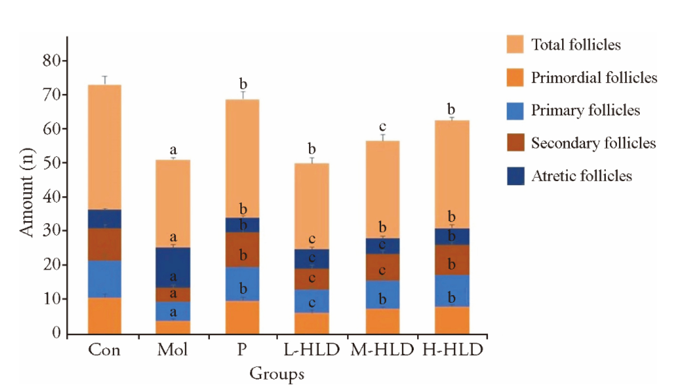 Figure 2 Comparison of the number of follicles at different levels in each group of mice Con: control group; Mol: model group; P: premarin group; L-HLD, M-HLD and H-HLD represent low, moderate, and high dose of Huluan decotion groups, respectively. Mice in the model, premarin, and HLD groups were administered a loading dose of CTX (100 mg·kg-1·d-1) followed by daily injections for 2 weeks, and then, positive group treated with premarin (0.03 mg/kg) once daily for 4 weeks. Control and model group received the same volume of distilled water, low (2 g/kg), moderate (5 g/kg, the dose used in vivo in human studies), and high (10 g/kg) dose of HLD groups treated by gastrogavage once daily for 4 weeks. The numbers of primary and secondary follicles in the Mol group decreased significantly compared with those in the con group, while treatment with HLD or premarin, the numbers of primary and secondary follicles increased significantly compared with those in the model group. HLD: Huluan decotion; CTX: cyclophosphamide. Data are presented as the mean ± standard deviation using one-way analysis of variance (n = 10). aP < 0.01 vs group Control; bP < 0.01 vs group MOL; cP < 0.05 vs group Mol.