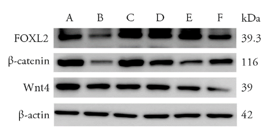 Figure 4 Expression Wnt4, β- catenin and FOXL2 proteins in the ovaries of mice in each group. A: control group; B: model group; C: premarin group; D: low dose of HLD group; E: moderate dose of HLD group; F: high dose of HLD group. Mice in the model, premarin, and HLD groups were administered a loading dose of CTX (100 mg·kg-1·d-1) followed by daily injections for 2 weeks, and then, positive group treated with premarin (0.03 mg/kg) once daily for 4 weeks. Control and model group received the same volume of distilled water, low (2 g/kg), moderate (5 g/kg, the dose used in vivo in human studies), and high (10 g/kg) dose of HLD groups treated by gastrogavage once daily for 4 weeks. Wnt4, β-catenin, and FOXL2 expression were detected by Western blot analysis. Wnt4, β-catenin, and FOXL2 levels in ovarian tissue decrease in the model group compared to the control group, while administration of HLD or Premarin elevated levels of these proteins. HLD: Huluan decotion; CTX: cyclophosphamide; FOXL2: Forkhead Box L2; Wnt4: WNT family member 4.