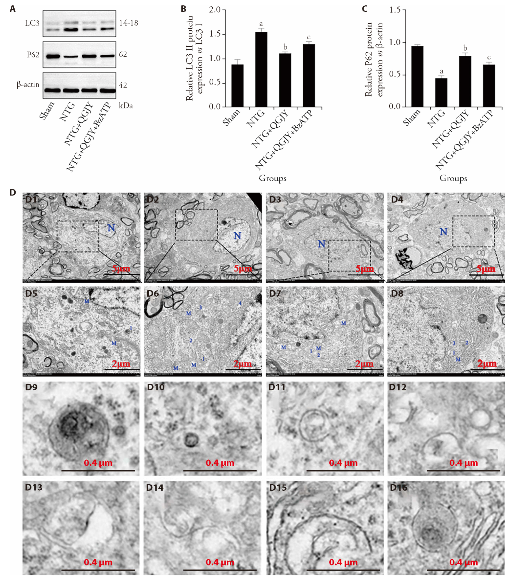 Figure 4 QGJY inhibits autophagy in TNC tissues of migraine rats A: Western blot of LC3 and P62; B: relative LC3 Ⅱ protein expression vs LC3 Ⅰ; C: relative P62 protein expression vs β-actin; D: TEM images of the TNC tissues in different groups; D1: sham (TEM); D2: NTG (TEM); D3 NTG + QGJY (TEM); D4: NTG + QGJY + BzATP (TEM); D5: sham (enlarge); D6: NTG (enlarge); D7 NTG + QGJY (enlarge); D8: NTG + QGJY + BzATP (enlarge); D9: autophagosome (sham); D10, D11, D12, D13: autophagosomes (NTG); D14: autophagosome (NTG + QGJY); D15, D16: autophagosome (NTG + QGJY + BzATP). Scale bar: 5 μm (2 μm, enlarged); Sham group: received daily gavage of 0.9% saline (10 mL/kg) for 7 consecutive days, followed by a subcutaneous injection of saline at the posterior neck on day 7; NTG group: received daily gavage of 0.9% saline for 7 d, followed by a subcutaneous injection of 10 mg/kg NTG at the posterior neck on day 7; NTG + QGJY Group: received daily gavage of QGJY (at the same volume as saline) for 7 d, followed by a subcutaneous injection of 10 mg/kg NTG on day 7; NTG + QGJY + BzATP Group: received daily gavage of QGJY for 7 d, followed by a co-injection of 10 mg/kg NTG and 3.5 mg/kg BzATP subcutaneously on day 7. TNC: trigeminal nucleus caudalis; QGJY: optimizing Qinggan Jieyu decoction; LC3: light chain 3; P62: elevated ubiquitin-binding protein p62; TEM: transmission electron microscopy; NTG: nitroglycerin; BzATP: BzATP triethylammonium salt. One-way analysis of variance was used to compare more than two groups, followed by Tukey’s post hoc test for pairwise comparisons. Values are expressed as mean ± standard deviation (n = 6). aP < 0.05, sham group compared to NTG group; bP < 0.05, NTG + QGJY group compared to NTG group; cP < 0.05, NTG + QGJY group compared to NTG + QGJY + BzATP group.