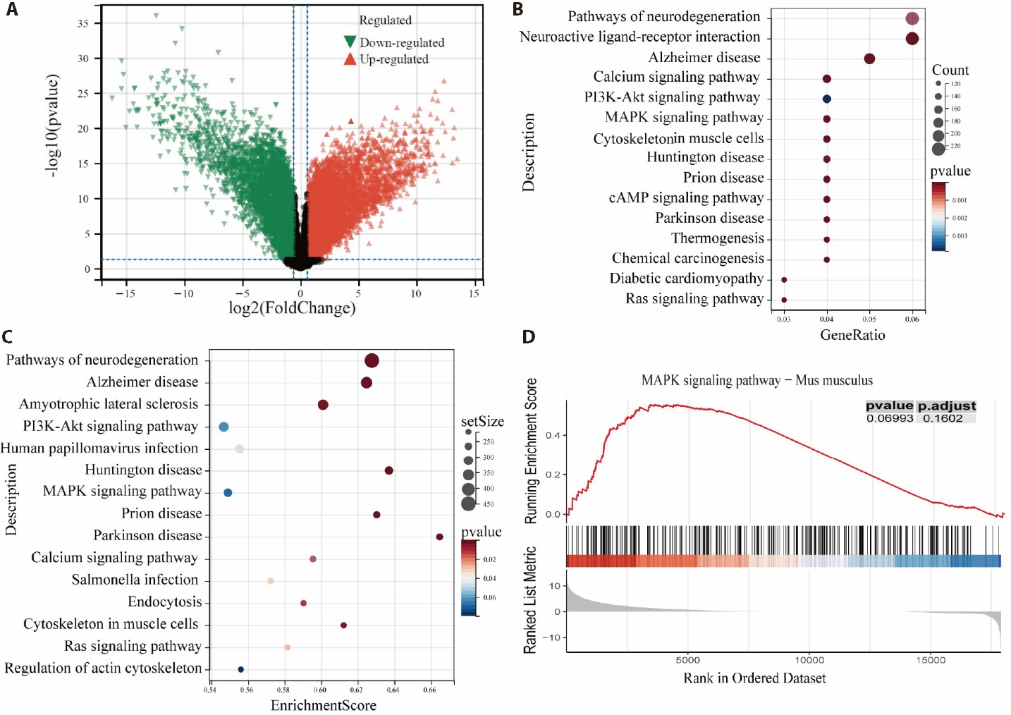 Figure 1 Transcriptome analysis implicates p38 MAPK/MSK1 signaling in mediating MCAO-induced injury A: volcano plot showing differentially expressed in MCAO; B: KEGG analysis examining differentially expressed genes in MCAO; C: KEGG pathway enrichment analysis highlighting the MAPK signaling pathway; D: enrichment plot of the MAPK signaling pathway identified by gene set enrichment analysis. Sham group: neck incision without filament insertion; MCAO group: ischemic-reperfusion injury without intervention. MCAO: middle cerebral artery occlusion. KEGG: kyoto encyclopedia of genes and genomes; DEGs: differentially expressed genes; GSEA: gene set enrichment analysis; MAPK: mitogen-activated protein kinase; MSK1: mitogen- and stress-activated protein kinase 1.