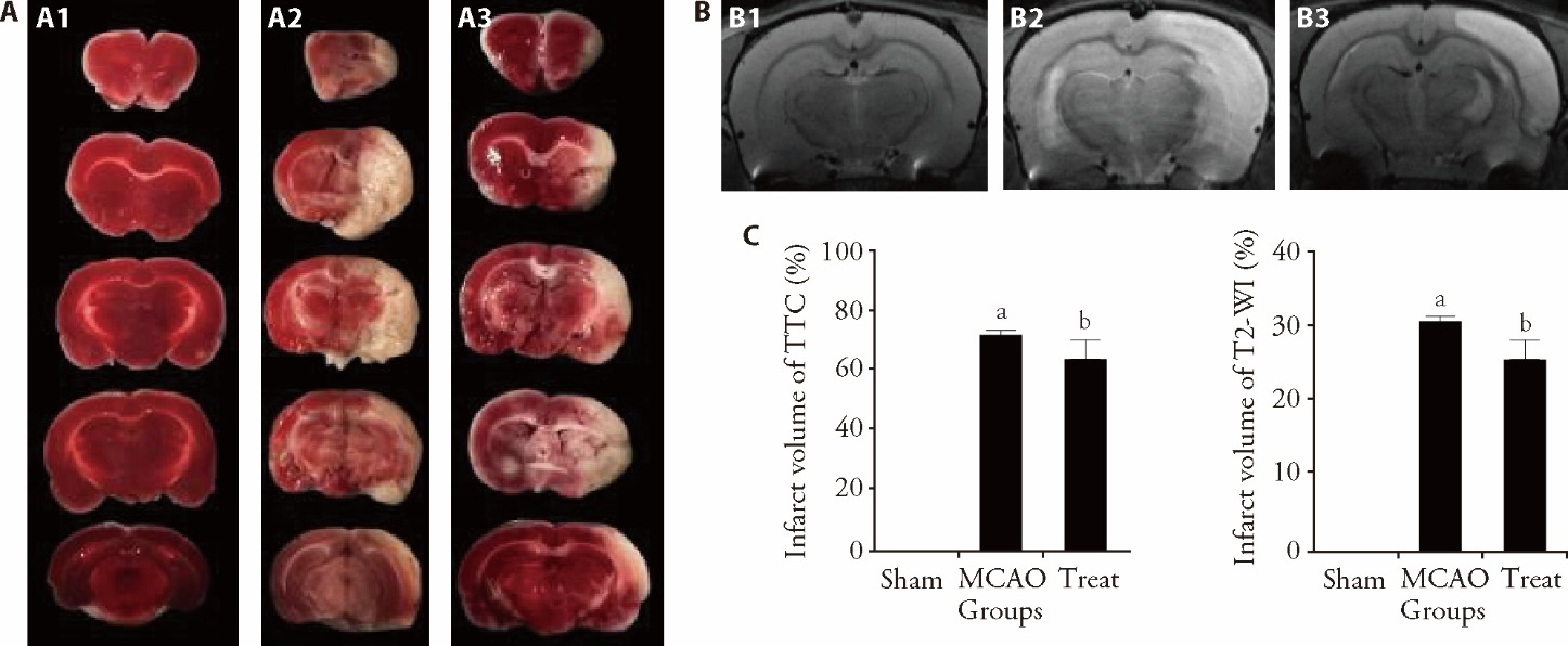 Figure 3 Acupuncture improves MCAO-induced brain infarction and fosters neural repair A: TTC staining; B: T2WI; A1, B1: sham group; A2, B2: MCAO group; A3, B3: treat group. C: brain infarct area quantification (n = 3); C1: infarct volume quantified by TTC staining; C2: infarct volume quantified by T2-weighted imaging.Sham group: neck incision without filament insertion; MCAO group: ischemia-reperfusion injury without intervention; Treat group: MCAO followed by daily acupuncture treatment. Acupuncture was performed at Baihui (GV20) and Dazhui (GV14) using sterilized stainless-steel filiform needles in daily 15-min sessions for 7 d. MCAO: middle cerebral artery occlusion; T2WI: T2-weighted imaging; TTC: 2,3,5-triphenyltetrazolium chloride; ANOVA: analysis of variance. Data are presented as mean ± standard deviation. Behavioral data were analyzed by repeated-measures ANOVA; other data by one-way ANOVA with Tukey’s post hoc test. Compared with the Sham group, aP < 0.05; compared with the MCAO group, bP < 0.05.