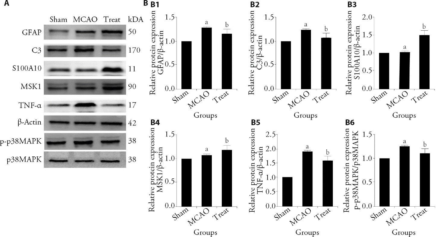 Figure 4 Acupuncture modulates reactive astrocyte polarization and improves neurological recovery after ischemia A: Western blot analysis of proteins involved in the p38 MAPK/MSK1 pathway; B1: GFAP; B2: C3; B3: S100A10; B4: MSK1; B5: TNF-α; B6: p-p38 MAPK/p38 MAPK. Sham group: neck incision without filament insertion; MCAO group: ischemia-reperfusion injury without intervention; treat group: MCAO followed by daily acupuncture treatment. Acupuncture was performed at Baihui (GV20) and Dazhui (GV14) using sterilized stainless-steel filiform needles in daily 15-min sessions for 7 d. GFAP: glial fibrillary acidic protein; C3: complement component 3; S100A10: S100 calcium-binding protein A10; MSK1: mitogen- and stress-activated protein kinase 1; TNF-α: tumor necrosis factor-alpha; p-p38 MAPK: phosphorylated p38 mitogen-activated protein kinase; p38 MAPK: p38 mitogen-activated protein kinase; ANOVA: analysis of variance. The data are presented as mean ± standard deviation (n = 3). Data were analyzed using one-way ANOVA, followed by Tukey’s post hoc test. A P-value < 0.05 was considered statistically significant. Compared with the sham operation group, aP < 0.05; compared with the MCAO group, bP < 0.05.