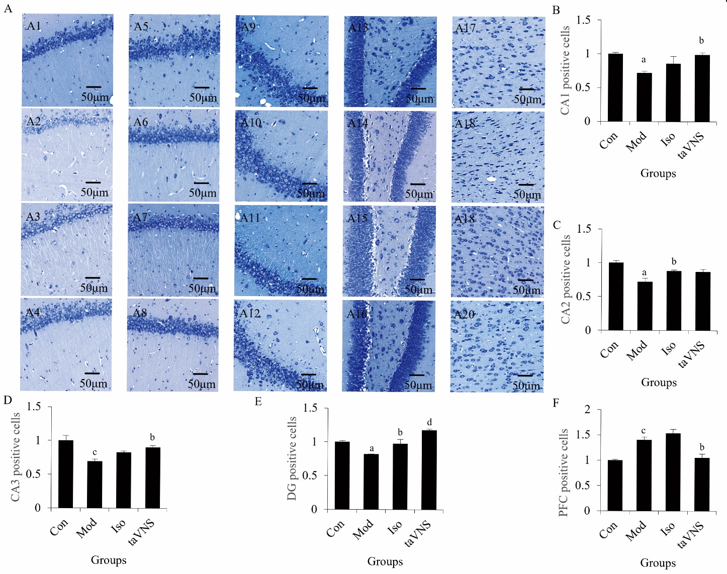 Figure 2 Effect of taVNS on the HIP and PFC in a rat model of PTSD A: Nissl staining in the hippocampal CA1, CA2, CA3, DG and PFC subregion; A1: hippocampal CA1 of Con group; A2: hippocampal CA1 of Mod group; A3: hippocampal CA1 of Iso group; A4: hippocampal CA1 of taVNS group; A5: hippocampal CA2 of Con group; A6: hippocampal CA2 of Mod group; A7: hippocampal CA2 of Iso group; A8: hippocampal CA2 of taVNS group; A9: hippocampal CA3 of Con group; A10: hippocampal CA3 of Mod group; A11: hippocampal CA3 of Iso group; A12: hippocampal CA3 of taVNS group; A13: hippocampal DG of Con group; A14: hippocampal DG of Mod group; A15: hippocampal DG of Iso group; A16: hippocampal DG of taVNS group; A17: PFC of Con group; A18: PFC of Mod group; A19: PFC of Iso group; A20: PFC of taVNS group; B: Nissl staining statistical analysis in the hippocampal CA1, subregion; C: Nissl staining statistical analysis in the hippocampal CA2 subregion; D: Nissl staining statistical analysis in the hippocampal CA3 subregion; E: Nissl staining statistical analysis in the hippocampal DG subregion; F: Nissl staining statistical analysis in the PFC region. Con: drink freely and eat freely; Mod: Con + SPS model; Iso: Con + SPS model + 14-d of anesthesia by isoflurane (30 min/d); taVNS: Con + SPS model + 14-d of taVNS anesthesia by isoflurane (30 min/d). taVNS: transcutaneous auricular vagus nerve stimulation; SPS: single prolonged stress; Iso: isoflurane; CA: cornu ammonis; DG: dentate gyrus; PFC: prefrontal cortex; HIP: hippocampal; SEM: standard error of the mean. Data are presented as mean ± SEM (n = 3 per group). Data were analyzed using one-way repeated-measures analysis of variance, followed by Tukey’s post hoc test when significant F ratios were obtained. aP < 0.05, cP < 0.01 versus the Con group; bP < 0.05, dP < 0.01 versus the Mod group.