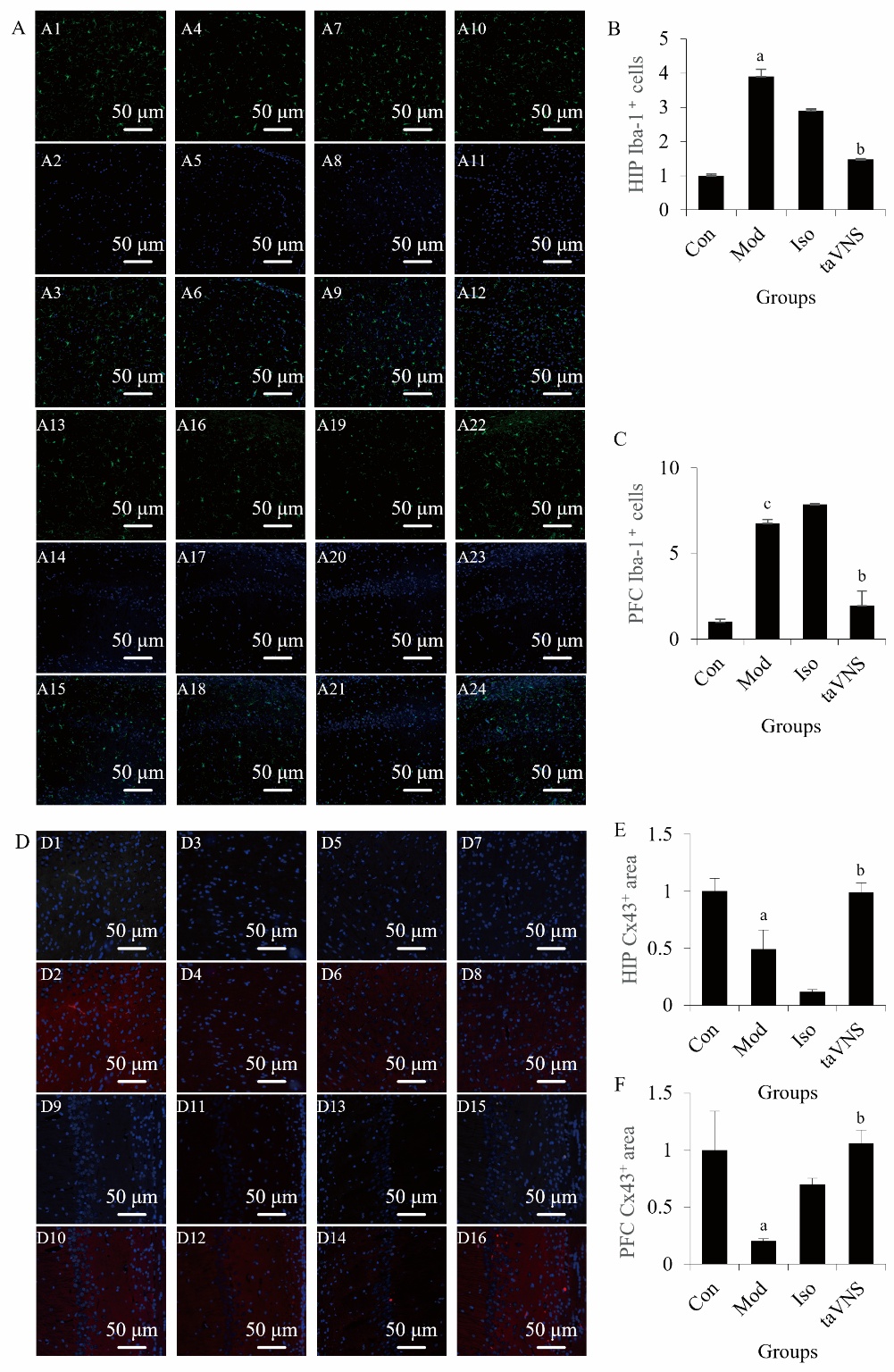 Figure 3 Effect of taVNS on microglial morphology and connexins in the HIP and PFC of a rat model of PTSD A: representative images of Iba-1 immunofluorescence. A1: Iba-1 immunofluorescence of Con group in PFC; A2: dapi of Con group in PFC; A3: merge of Con group in PFC; A4: Iba-1 immunofluorescence of Mod group in PFC; A5: dapi of Mod group in PFC; A6:merge of Mod group in PFC; A7: Iba-1 immunofluorescence of Iso group in PFC; A8: dapi of Iso group in PFC; A9: merge of Iso group in PFC; A10: Iba-1 immunofluorescence of taVNS group in PFC; A11: dapi of taVNS group in PFC; A12: merge of taVNS group in PFC; A13: Iba-1 immunofluorescence of Con group in HIP; A14: dapi of Con group in HIP; A15: merge of Con group in HIP; A16: Iba-1 immunofluorescence of Mod group in HIP; A17: dapi of Mod group in HIP; A18: merge of Mod group in HIP; A19: Iba-1 immunofluorescence of Iso group in HIP; A20: dapi of Iso group in HIP; A21: merge of Iso group in HIP; A22: Iba-1 immunofluorescence of taVNS group in HIP; A23: dapi of taVNS group in HIP; A24: merge of taVNS group in HIP; B: quantification of Iba-1-positive cells (fold of control) in the PFC; C: quantification of Iba-1-positive cells (fold of control) in the Hip; D: representative images of Cx43 immunofluorescence; D1: Cx43 immunofluorescence of Con group in PFC; D2: merge of Con group in PFC; D3: Cx43 immunofluorescence of Mod group in PFC; D4: merge of Mod group in PFC; D5: Cx43 immunofluorescence of Iso group in PFC; D6: merge of Iso group in PFC; D7: Cx43 immunofluorescence of taVNS group in PFC; D8: merge of taVNS group in PFC; E: quantification of Cx43 area (fold of control) in the PFC; F: quantification of Cx43 area (fold of control) in the Hip. Con: drink freely and eat freely; Mod: Con + SPS model; Iso: Con + SPS model + 14-d of anesthesia by isoflurane (30 min/d); taVNS: Con + SPS model + 14-d of taVNS anesthesia by isoflurane (30 min/d). taVNS: transcutaneous auricular vagus nerve stimulation; SPS: single prolonged stress; Iso: isoflurane; Iba-1: ionized calcium-binding adapter molecule 1; Cx43: connexin43; PFC: prefrontal cortex; HIP: hippocampal; SEM: standard error of the mean. Data are presented as mean ± SEM (n = 3 per group). Data were analyzed using one-way repeated-measures analysis of variance, followed by Tukey’s post hoc test when significant F ratios were obtained. aP < 0.05 versus the Con group; bP < 0.05 versus the Mod group.